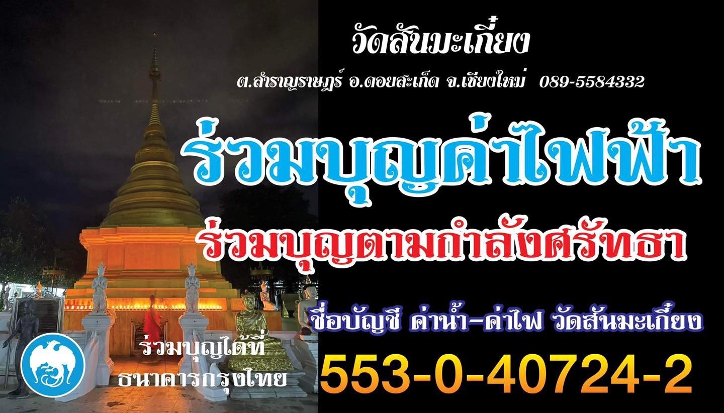 สำหรับศรัทธาประชาชน ลูกศิษย์ลูกหา ร่วมทำบุญตามกำลังศรัทธาได้ที่ บัญชี : ธนากรุงไทย ชื่อบัญชี : ค่าน้ำ-ค่าไฟ วัดสันมะเกี๋ยง เลขที่บัญชี : 553-0-40724-2 สอบถามเพิ่มเติมได้ที่โทร. 089-5584332 เจ้าอาวาส ขออานิสงค์ ในการเพิ่มเติมแสงสว่างในพระพุทธศาสนา ให้ท่านเจริญรุ่งเรืองด้วย หน้าที่การงาน การเงิน รวย รวย รวย