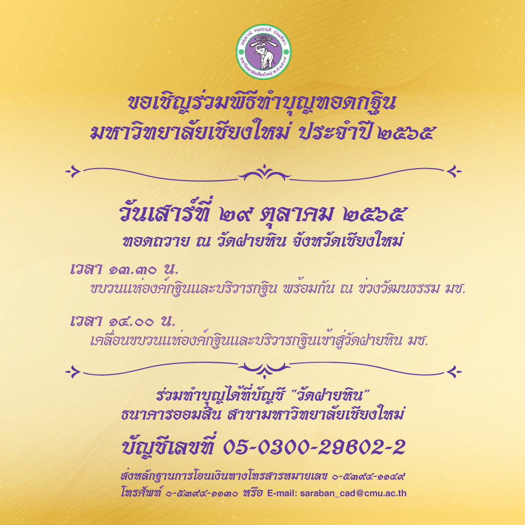ขอเชิญร่วมทำบุญทอดกฐินมหาวิทยาลัยเชียงใหม่ วันเสาร์ที่ 29 ต.ค. 2565 ณ วัดฝายหิน
