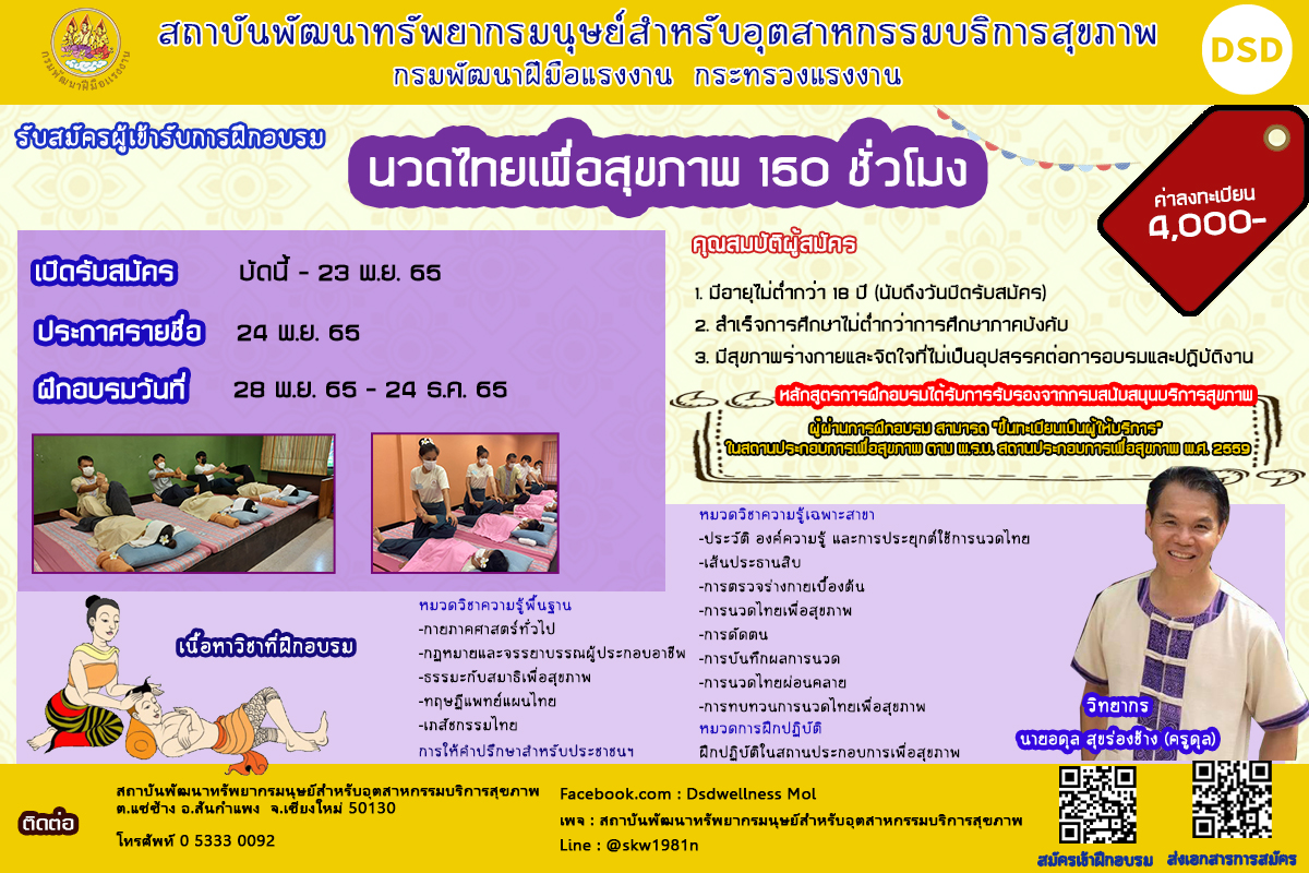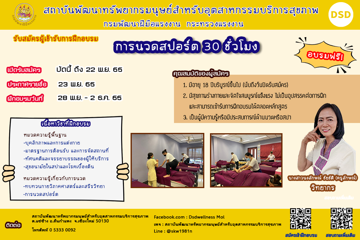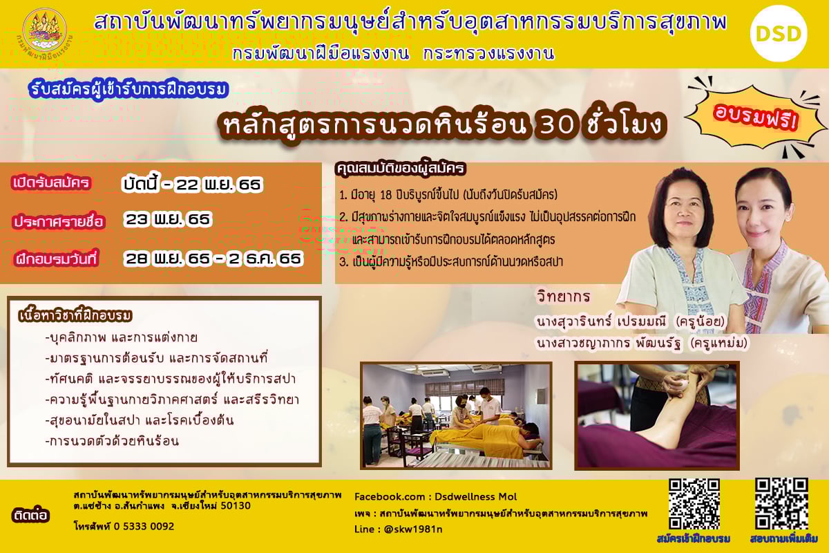 จึงขอเชิญชวนผู้สนใจ และนายจ้างส่งพนักงาน เข้ารับการฝึกอบรมด้านการนวดไทยและสปาเพื่อสุขภาพ