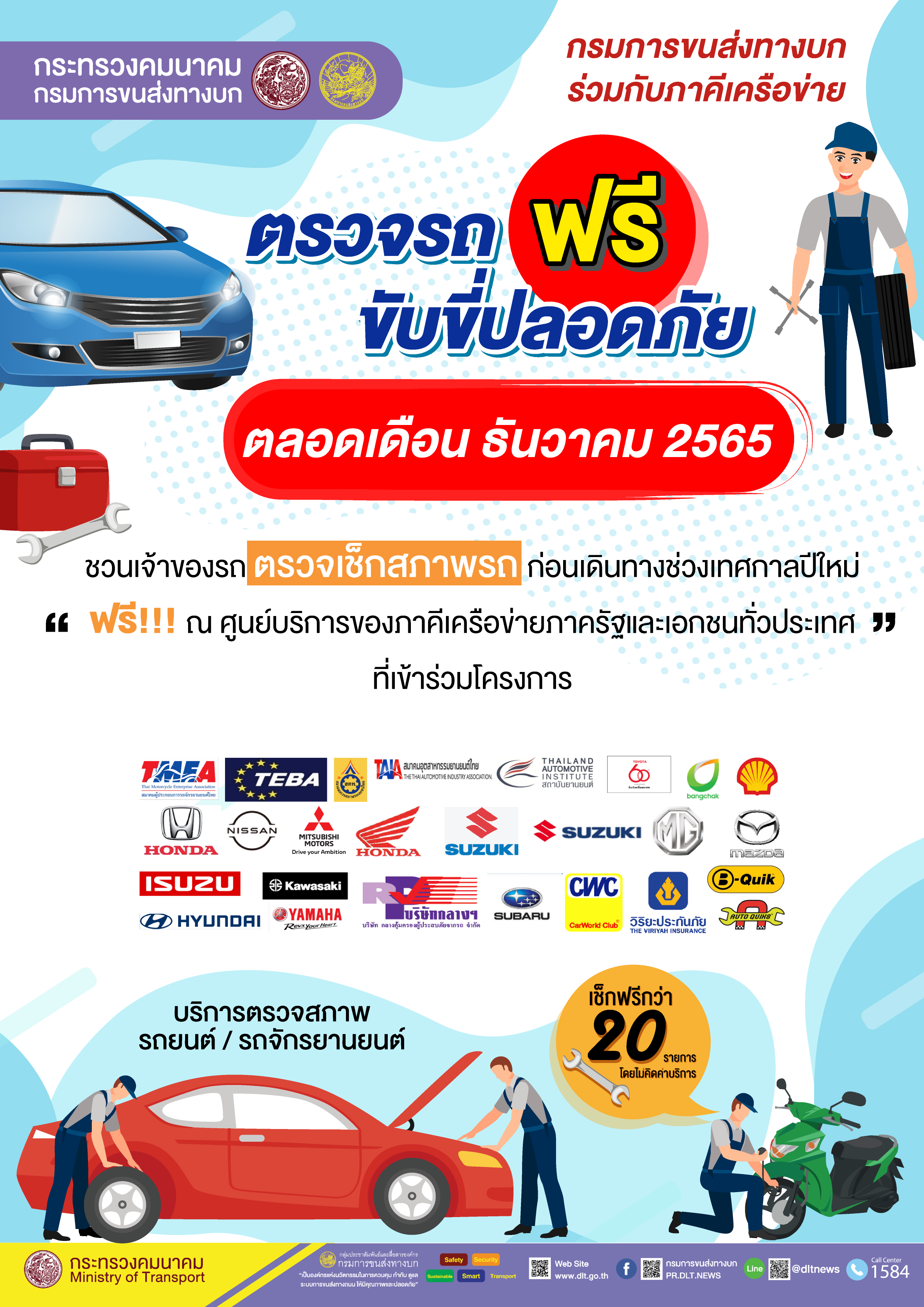 กรมการขนส่งทางบก จัดกิจกรรม “ตรวจรถฟรี ขับขี่ปลอดภัย” ชวนเจ้าของรถตรวจเช็คสภาพรถให้พร้อมก่อนเดินทางช่วงเทศกาลปีใหม่ฟรี ณ ศูนย์บริการของภาคีเครือข่ายภาครัฐและเอกชนทั่วประเทศตลอดเดือนธันวาคม 2565 มุ่งมั่นลดอุบัติเหตุจากการขัดข้องของเครื่องยนต์