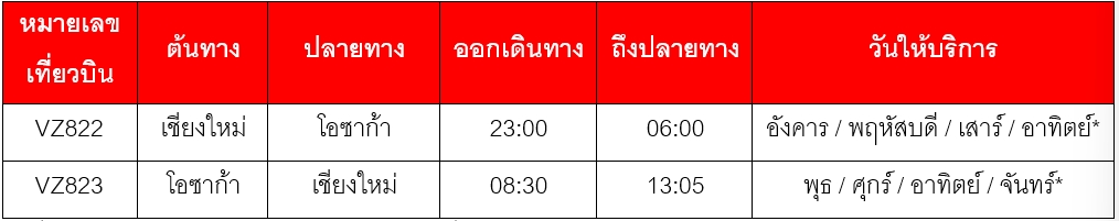 ณ ท่าอากาศยานนานาชาติเชียงใหม่ เที่ยวบินปฐมฤกษ์เที่ยวบินที่ VZ823 ซึ่งเดินทางจากท่าอากาศยานนานาชาติคันไซ สู่ ท่าอากาศยานนานาชาติเชียงใหม่ ได้รับการต้อนรับจาก นาย ฮิกุจิ เคอิจิ กงสุลใหญ่ญี่ปุ่น ณ นครเชียงใหม่ ว่าที่ ร.อ.สันติพงศ์ บุลยเลิศ สำนักงานการท่องเที่ยวและกีฬาเชียงใหม่ น.ส.สุลัดดา ศรุติลาวัณย์ ผู้อำนวยการ การท่องเที่ยวแห่งประเทศไทย สำนักงานจังหวัดเชียงใหม่ นายพัลลภ แซ่จิว ประธานสภาอุตสาหกรรมท่องเที่ยวแห่งประเทศไทย จังหวัดเชียงใหม่ พ.ต.ท.หญิง รติรส อัจฉริยะเสถียร. รอง ผกก.ด่าน ตม.ทอ.เชียงใหม่ น.ส.ลลิตา อรรถพิมล ด่านศุลกากรท่าอากาศยานเชียงใหม่ และนายณัฐวุฒิ ทาอินต๊ะ รองผู้อำนวยการ ท่าอากาศยานเชียงใหม่เชียงใหม่