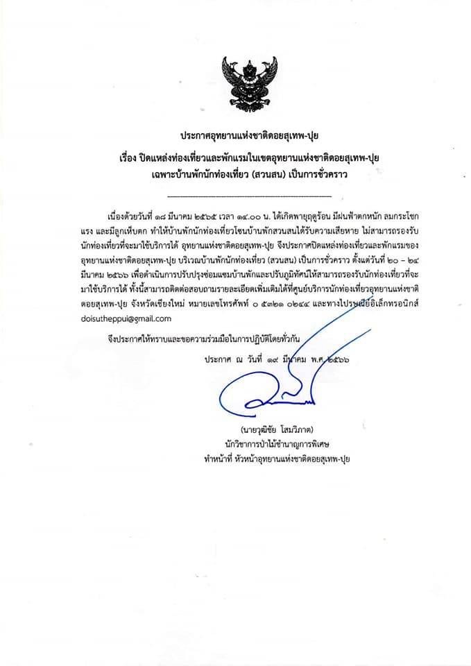 เมื่อวันที่ 19 มี.ค.66 ทางกรมอุทยานแห่งชาติ สัตว์ป่า และพันธุ์พืช โดยนายวุฒิชัย โสมวิภาค หัวหน้าอุทยานแห่งชาติดอนสุเทพ ปุย ได้ประกาศอุทยานแห่งชาติดอยสุเทพ-ปุย ปิดแหล่งท่องเที่ยวและพักแรมบริเวณสวนสนเป็นการชั่วคราว ตั้งแต่วันที่ 20 – 24 มีนาคม 2566