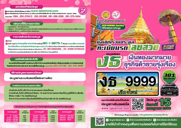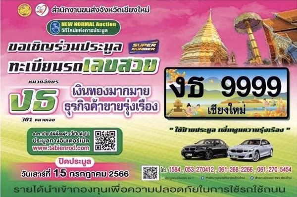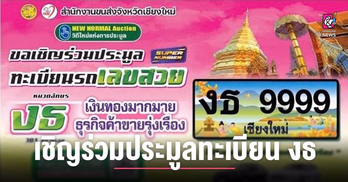 สำนักงานขนส่งจังหวัดเชียงใหม่ ขอเชิญร่วมประมูล ทะเบียนรถ เลขสวย หมวดอักษร งธ “เงินทองมากมาย ธุรกิจค้าขายรุ่งเรือง” จำนวน 301 หมายเลข