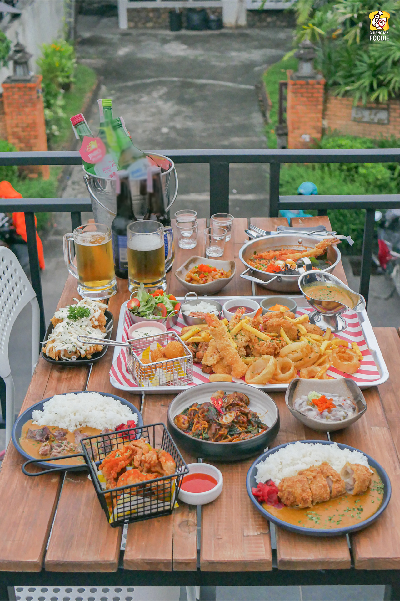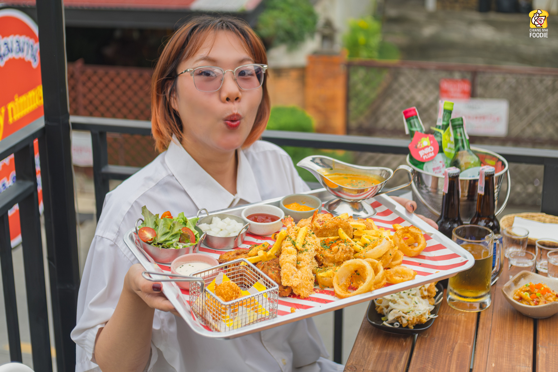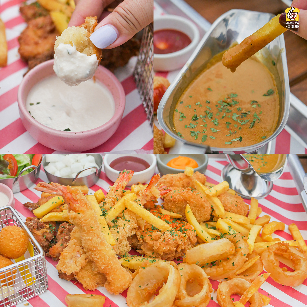 อิ่มท้องแล้วจะนั่งดื่มต่อ ก็ได้บรรยากาศนะ ชอบตรงชั้น 2 ของร้านคือเป็นระเบียงรับอากาศฉ่ำๆ เลย เดือนนี้มี 2 แถม 1 ซะด้วยย ช่างภาพของเจ่เจ้ก็ว้าวุ่นเลยทีนี้ สั่งเครื่องดื่มมาปั๊บ ตามด้วย ชุดทอดแบบเซทใหญ่มาเลยจย้าาา คือจะสั่งขนาดนี้ ไม่ต้องสั่งข้าวมาก็ได้…แต่น้องๆ บอกราตรีนี้อีกยาวไกล ลุยๆ เลยดีกว่า บอกเลยว่าเซทนี้มีซอสให้จิ้มให้จ้วงหลากหลายมาก ที่เด็ดคือซอสแกงกะหรี่ ทีหยิบอะไรในถาดมาจิ้มก็ได้ เออ มันอร่อยเข้ากันเลยแฮะ