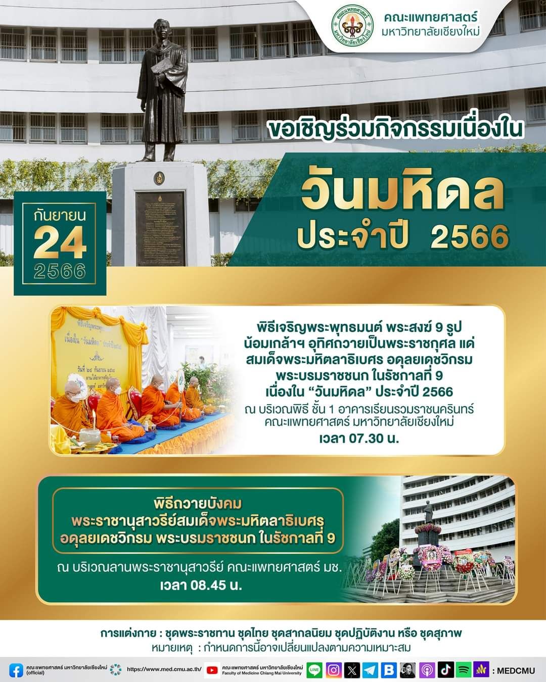 พิธีเจริญพระพุทธมนต์ พระสงฆ์ 9 รูป น้อมเกล้าฯ อุทิศถวายเป็นพระราชกุศล แด่ สมเด็จพระมหิตลาธิเบศร อดุลยเดชวิกรม พระบรมราชชนก ในรัชกาลที่ 9 เนื่องใน “วันมหิดล” ประจำปี 2566