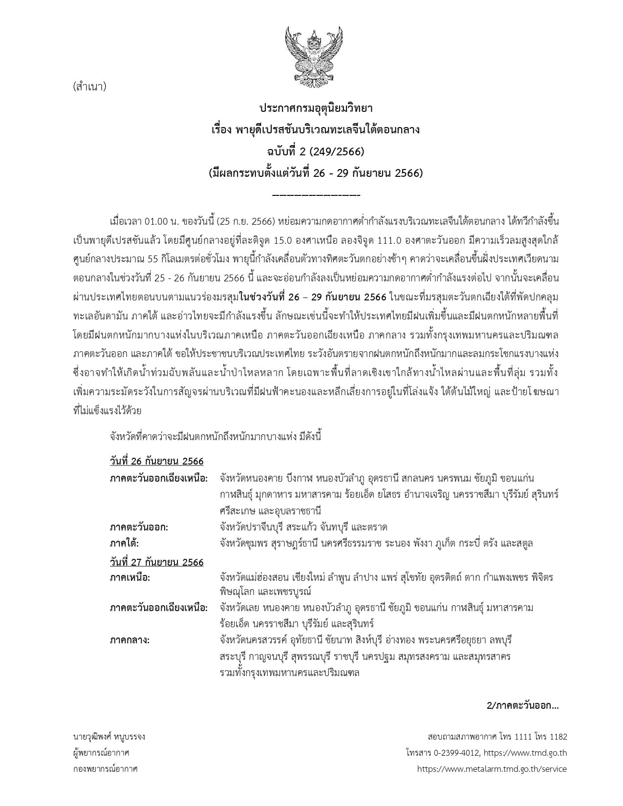 25 ก.ย. 66 กรมอุตุนิยมวิทยา ประกาศ ฉบับที่ 2 (249/2566) เรื่อง พายุดีเปรสชันบริเวณทะเลจีนใต้ตอนกลาง