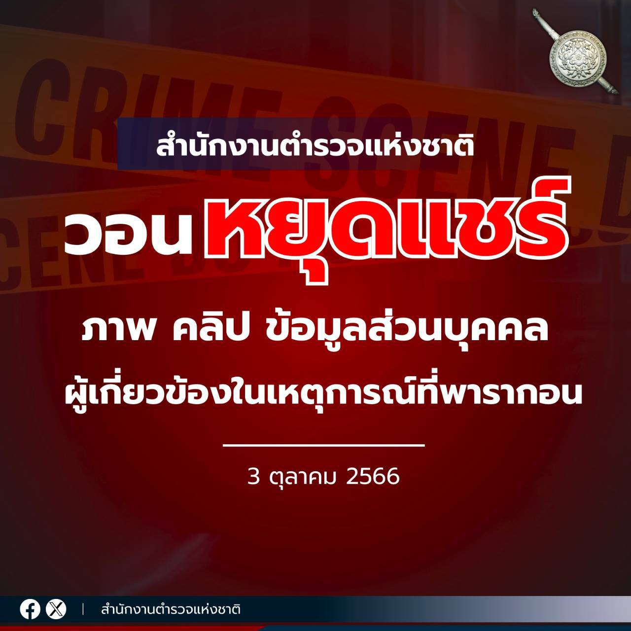 โฆษก ตร. กล่าวว่า เหตุการณ์ดังกล่าวเป็นความสูญเสียที่ไม่มีใครอยากให้เกิดขึ้น ก่อนอื่นต้องขอแสดงความเสียใจต่อครอบครัวผู้สูญเสีย รวมถึงผู้บาดเจ็บ และขอเตือนถึงผู้ใช้สังคมออนไลน์ทุกแพลตฟอร์ม กรุณางดแชร์ภาพ คลิปวิดีโอ เหตุการณ์ดังกล่าว ทั้งภาพคลิปของการเกิดเหตุ รวมทั้งภาพของผู้เสียชีวิตและบาดเจ็บ กรุณาเข้าใจถึงความรู้สึกของครอบครัวผู้ได้รับผลกระทบต่อเหตุการณ์ที่เกิดขึ้น ซึ่งเหตุความรุนแรงในลักษณะนี้มักก่อให้เกิดความโกรธแค้น ความโศกเศร้า ความกลัว และความวิตกกังวลต่อข่าวสาร แต่การนำเสนอหรือส่งต่อภาพความรุนแรงที่เกินความจำเป็นนั้นไม่มีประโยชน์ใดต่อสังคมโดยรวม ทั้งยังทำให้เกิดผลกระทบด้านสุขภาพจิตต่อสังคมได้ในวงกว้าง