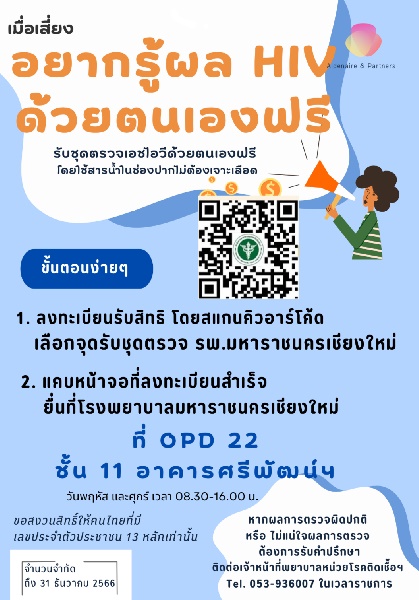 📍ที่ OPD 22 ชั้น 11 อาคารศรีพัฒน์ฯ วันพฤหัส และศุกร์ เวลา 08.30 -16.00 น. ❌ขอสงวนสิทธิ์ให้คนไทยที่มี เลขประจำตัวประชาชน 13 หลักเท่านั้น หากผลการตรวจผิดปกติ หรือไม่แน่ใจผลการตรวจ ต้องการรับคำปรึกษา ติดต่อเจ้าหน้าที่พยาบาลหน่วยโรคติดเชื้อฯ Tel. 053-936007 ในเวลาราชการ