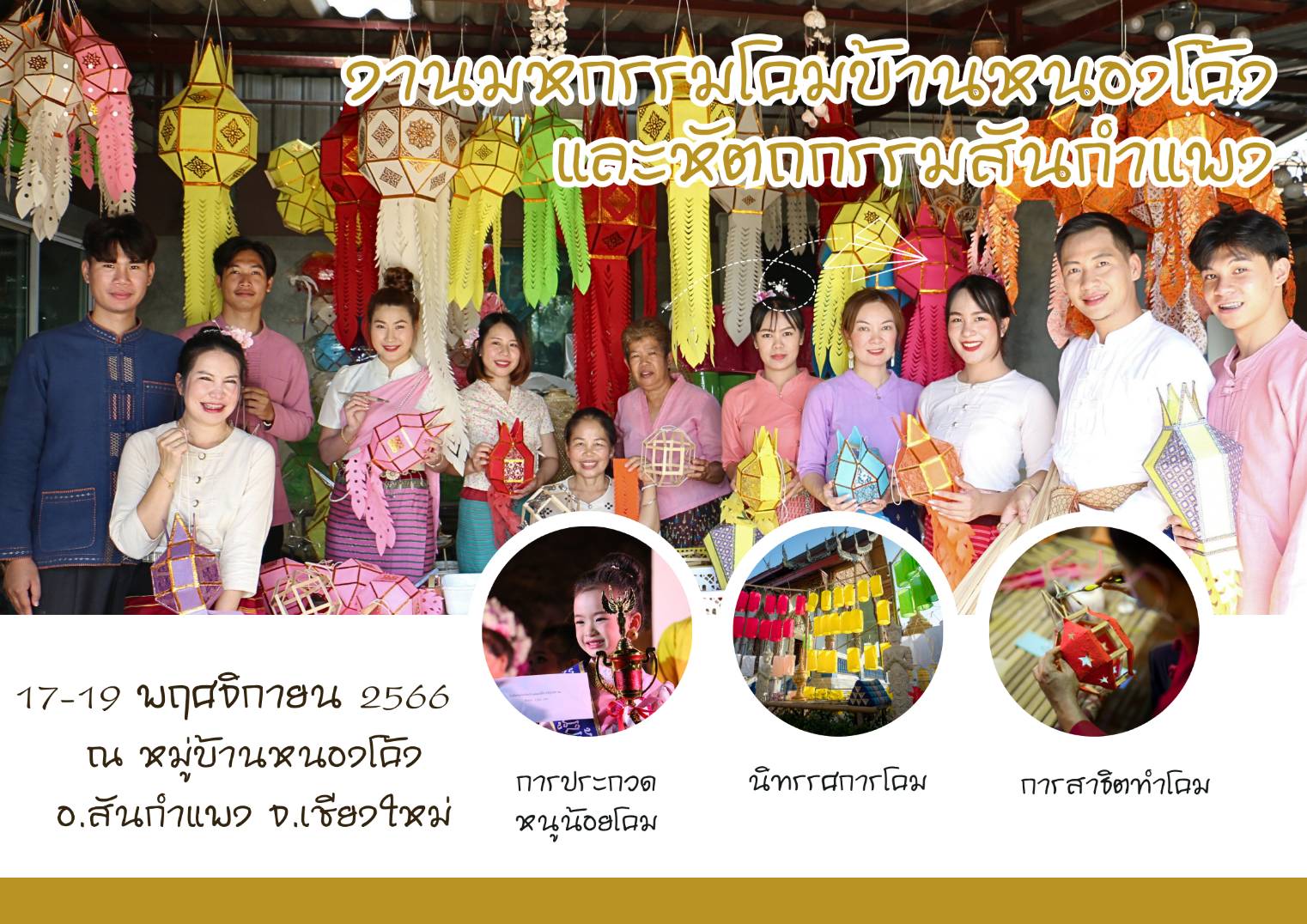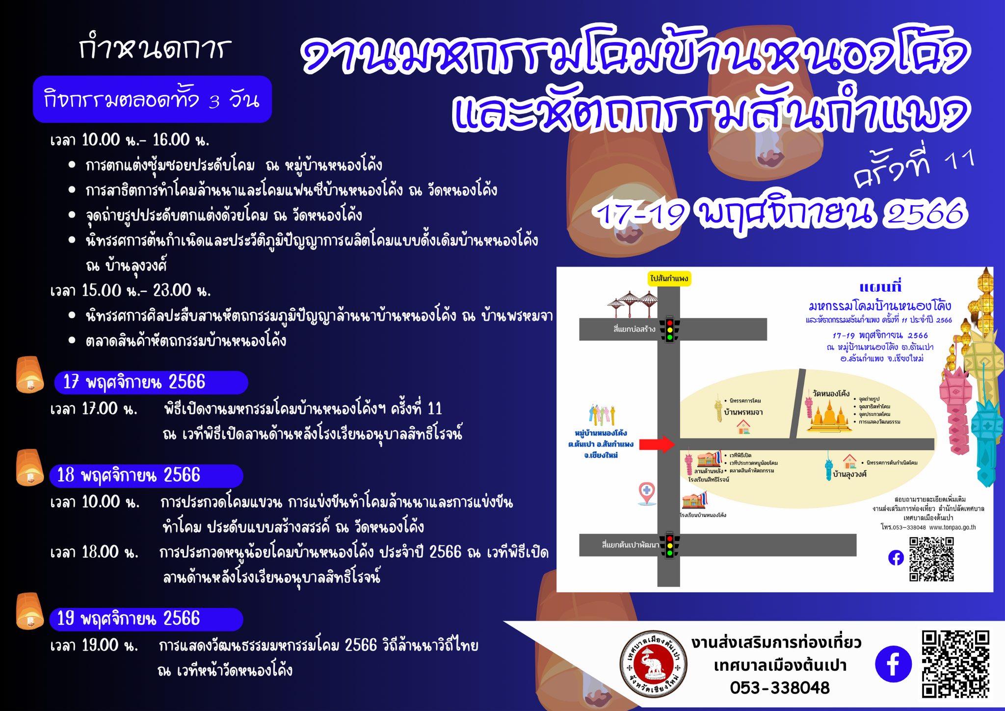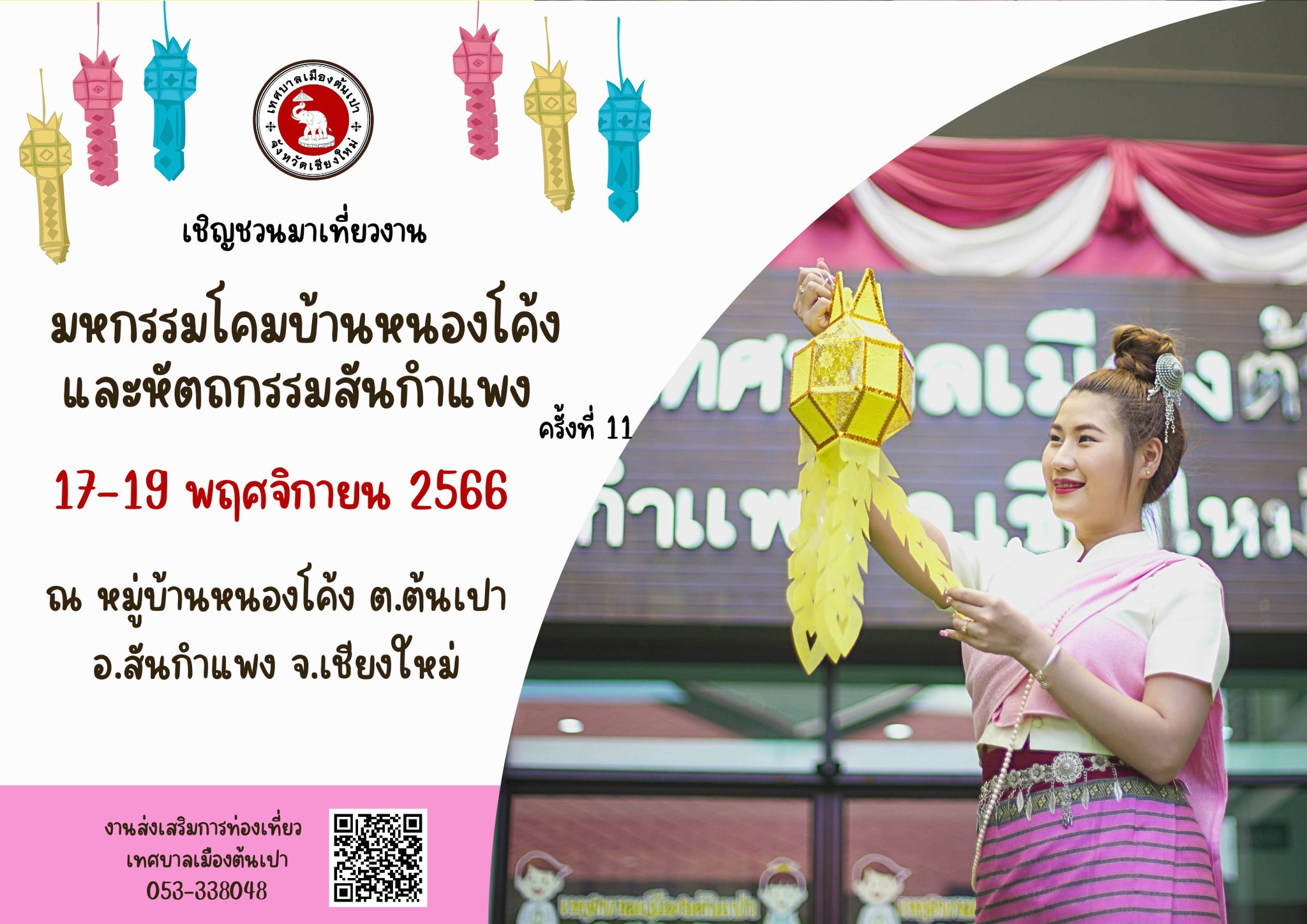 โอกาสนี้ จึงขอเชิญชวนมาเที่ยวงานมหกรรมโคมบ้านหนองโค้งและหัตถกรรมสันกำแพง ครั้งที่ 11 ในวันที่ 17 – 19 พฤศจิกายน 2566 ที่จะถึงนี้ ณ หมู่บ้านหนองโค้ง ตำบลต้นเปา อำเภอสันกำแพง จังหวัดเชียงใหม่ สอบถามข้อมูลหรือติดตามรายละเอียดได้ที่ เทศบาลเมืองต้นเปา งานส่งเสริมการท่องเที่ยว สำนักปลัดเทศบาล 0-5333-8048 หรือ เพจงานมหกรรมโคมบ้านหนองโค้งฯ