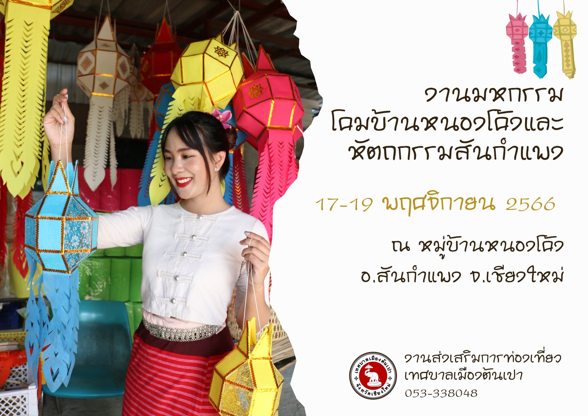 ทางร้อยตรีวิโรจน์ โชติธนาภักษ์ นายกเทศมนตรีเมืองต้นเปา อ.สันกำแพง จ.เชียงใหม่เปิดเผยว่า เทศบาลเมืองต้นเปา ร่วมกับหมู่บ้านหนองโค้ง จัดงานมหกรรมโคมบ้านหนองโค้งและหัตถกรรมสันกำแพง ครั้งที่ 11 ระหว่างวันที่ 17 -19 พฤศจิกายน 2566 ณ หมู่บ้านหนองโค้ง ตำบลต้นเปา อำเภอสันกำแพง จังหวัดเชียงใหม่ เพื่อประชาสัมพันธ์หมู่บ้านหนองโค้ง