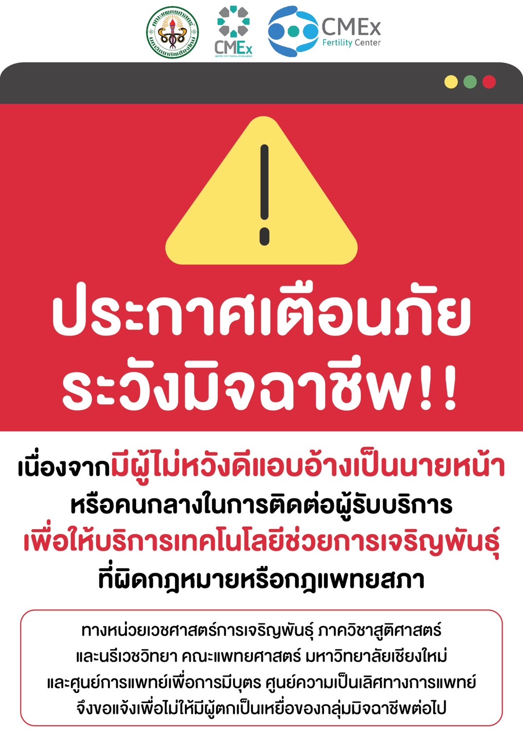 🔸เนื่องจากมีผู้ไม่หวังดีแอบอ้างเป็นนายหน้าหรือคนกลางในการติดต่อผู้รับบริการ เพื่อให้บริการเทคโนโลยีช่วยการเจริญพันธุ์ที่ผิดกฎหมายหรือกฎแพทยสภา