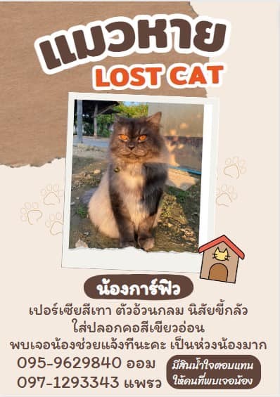 ตามหา “น้องการ์ฟิว” แมวพันธุ์เปอร์เซีย สีเทาอ่อนออกขาว ๆ ตัวอ้วนกลม หน้าดุแต่ขี้อ้อน