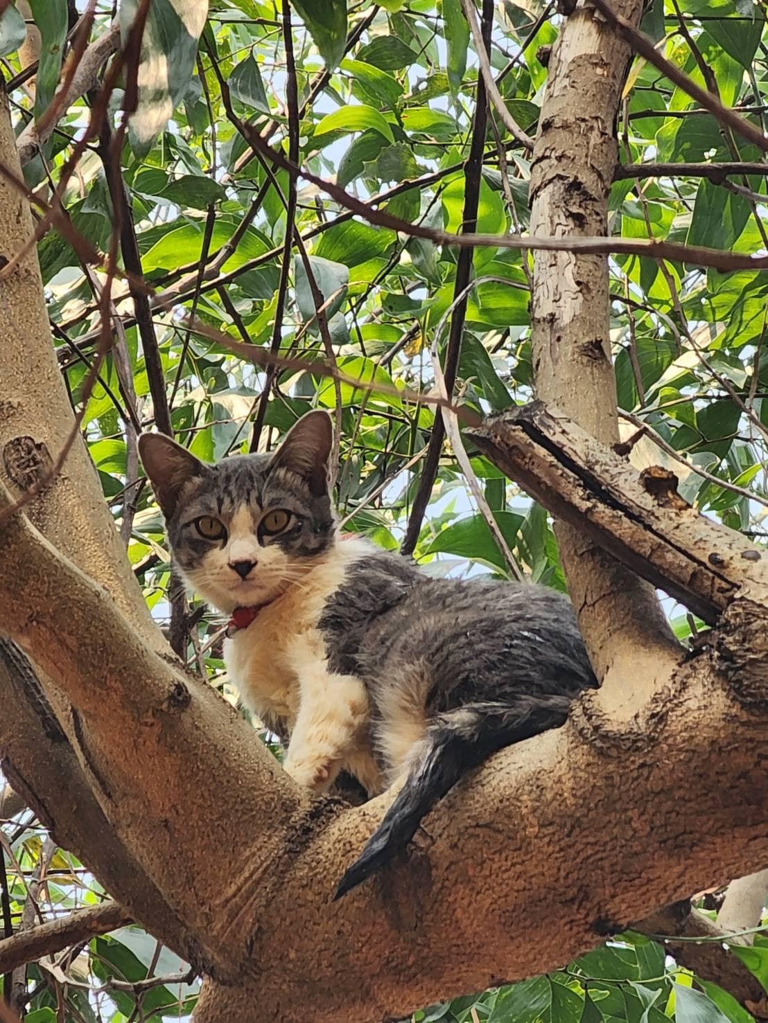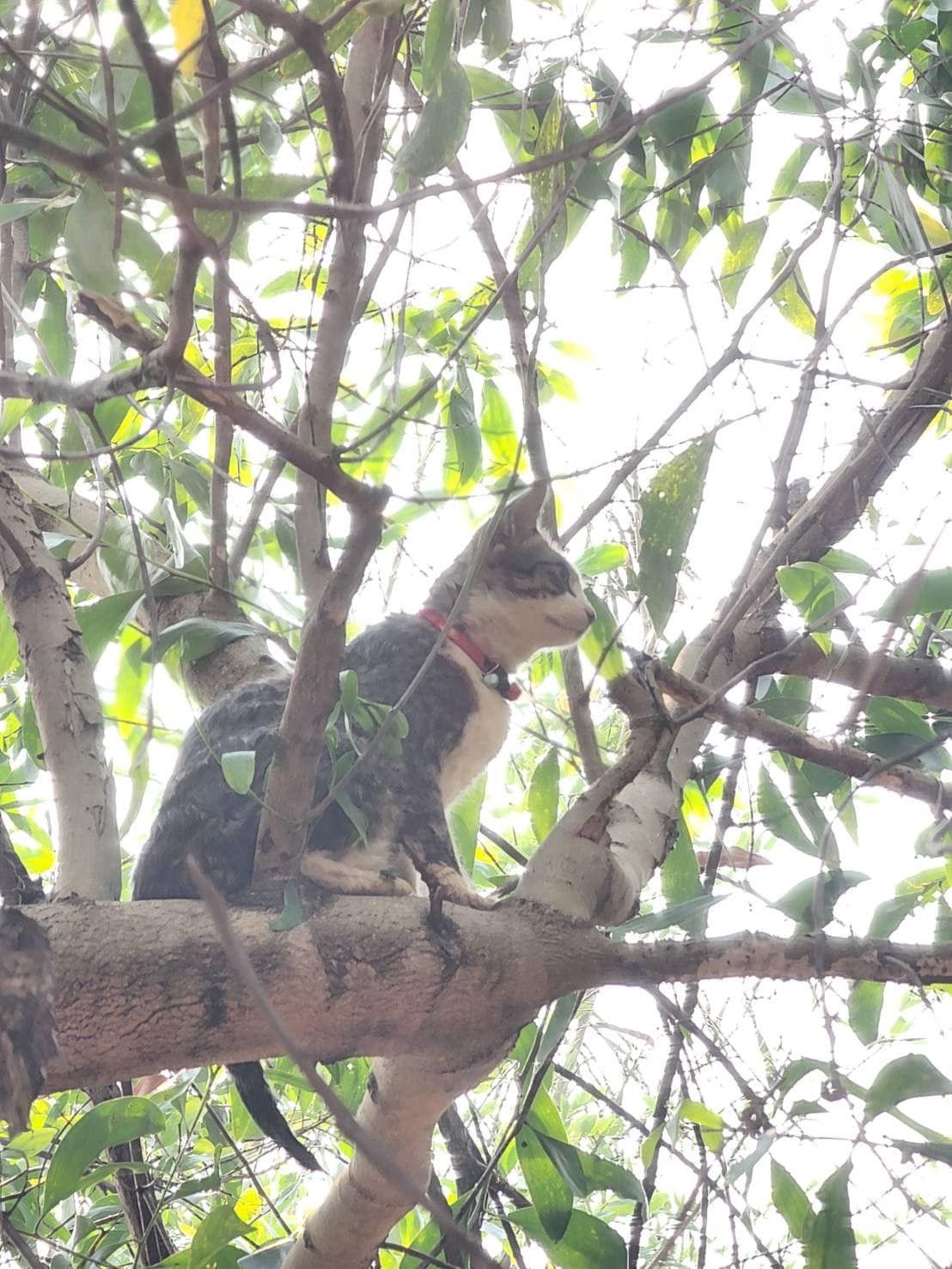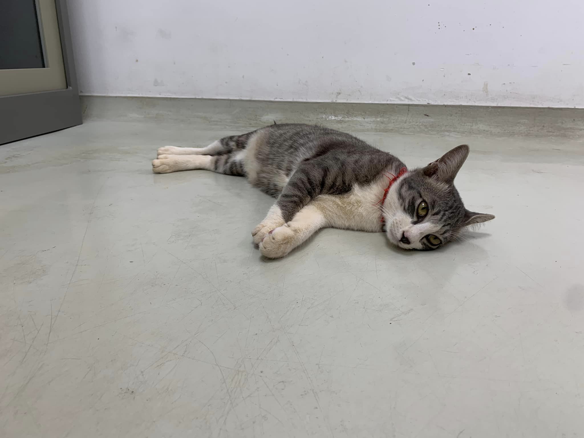 จุดสังเกตุ : มีปลอกคอแดง สภาพดูเก่าแล้ว น่าจะพันธุ์ไทย เพศผู้ ตัวสีเทาขาวค่ะ ยังไม่ได้ทำหมัน