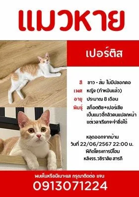 ตามหา “น้องเปอร์ติส” พันธุ์สก็อตติชผสมเปอร์เซีย สีขาวส้ม ไม่สวมปลอกคอ เพศหญิงทำหมันแล้ว อายุ 8 เดือน น้องนิสัยขี้กลัวคนแต่เรียกชื่อแล้วหัน