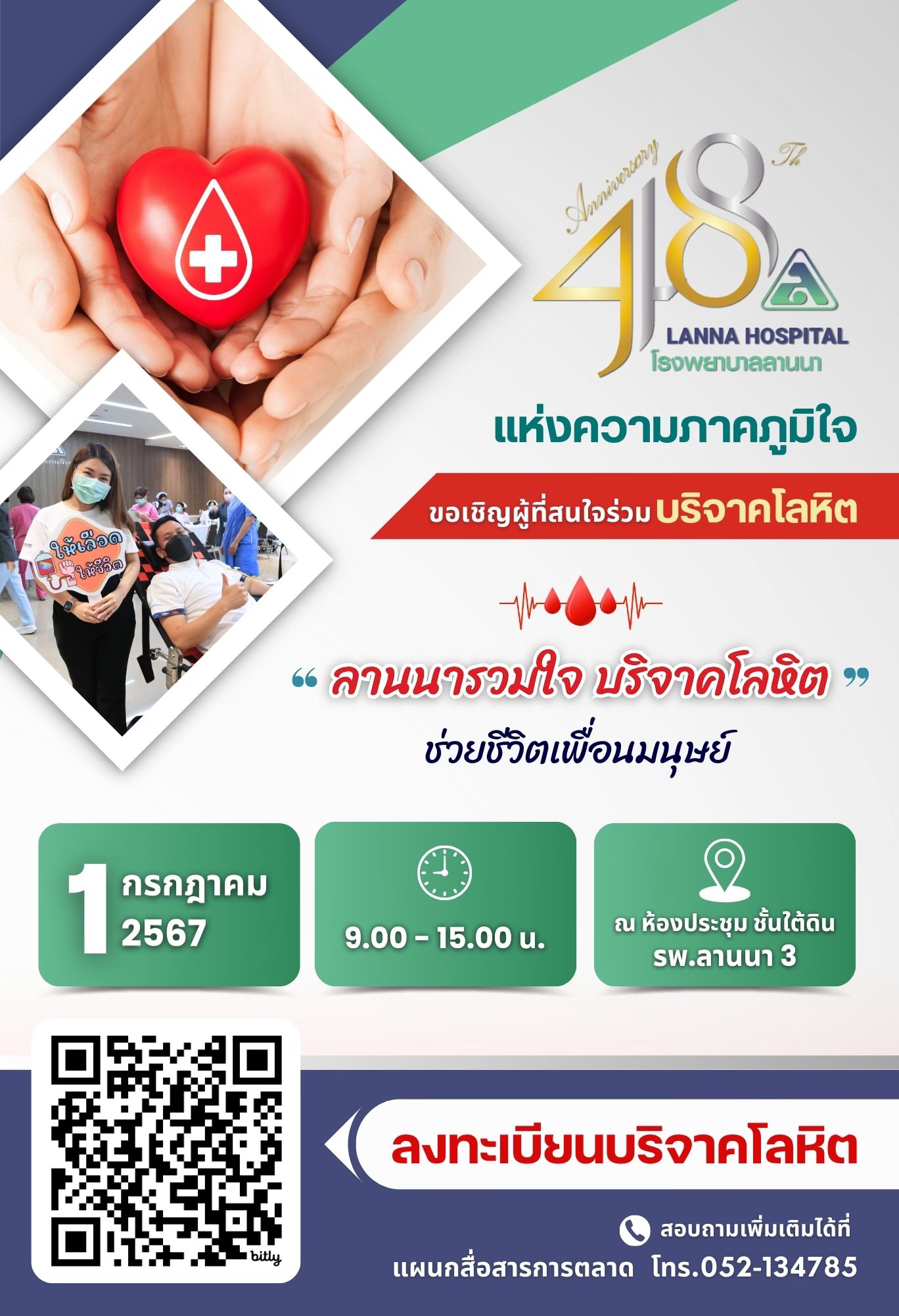 เนื่องในโอกาสครบรอบ 48 ปี โรงพยาบาลลานนา ขอเชิญชวนผู้สนใจทุกท่าน ร่วมบริจาคโลหิต เพื่อช่วยเหลือชีวิตเพื่อนมนุษย์