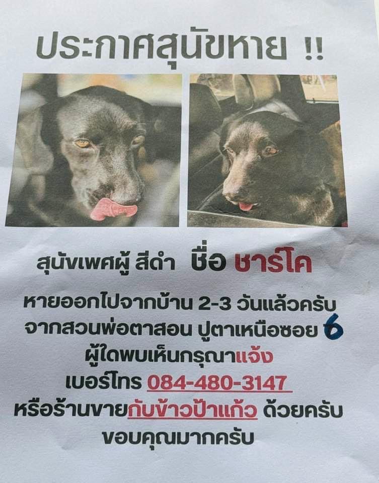 สุนัขเพศผู้ สีดำ ชื่อ “ชาร์โค” หายออกไปจากบ้าน 2-3 วันแล้ว จากสวนพ่อตาสอน ปูคาเหนือซอย 6 ผู้ใดพบเห็นกรุณาแจ้งเบอร์โทร 084-480-3147 หรือร้านขายกับข้าวป้าแก้ว มีสินน้ำใจมอบให้ด้วย”