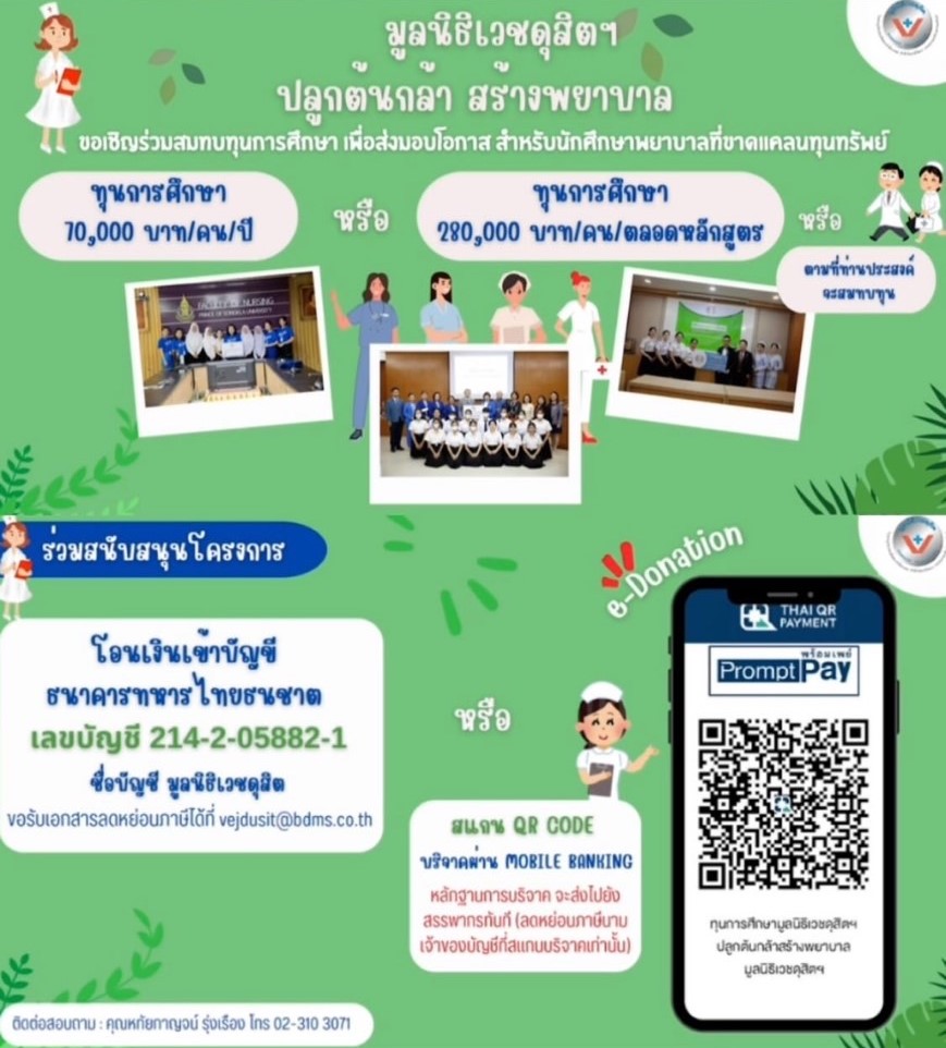 มูลนิธิเวชดุสิตฯ ขอเชิญชวนผู้มีจิตศรัทธาร่วมเป็นส่วนหนึ่ง ในการสร้างอนาคตของบุคลากรทางการแพทย์ ผ่านโครงการ “เวชดุสิตปลูกต้นกล้า สร้างพยาบาล” โดยการสนับสนุนทุนการศึกษาแก่นักศึกษาพยาบาลที่ขาดแคลนทุนทรัพย์ เพื่อเปิดโอกาสให้ได้ศึกษาต่อจนสำเร็จการศึกษา และเป็นพยาบาลที่มีคุณภาพ