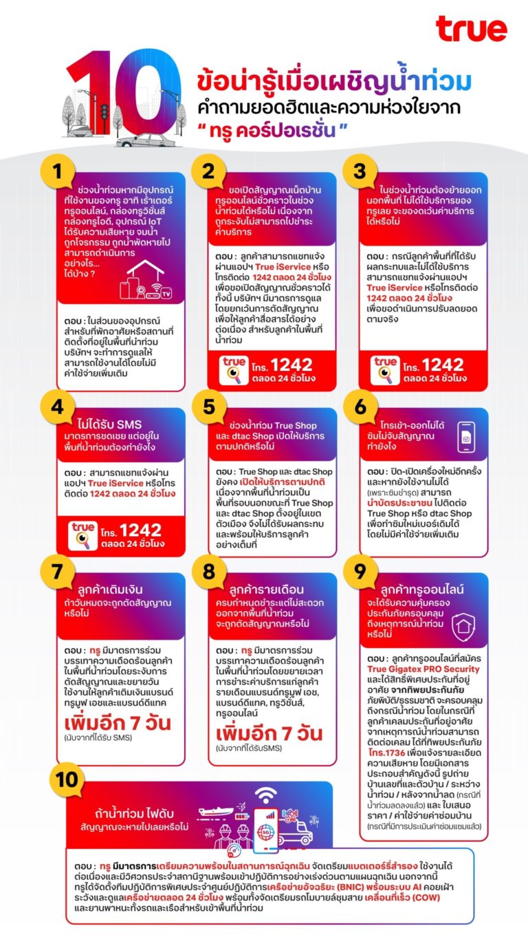 ตอบ : ทรูมีมาตรการเตรียมความพร้อมในสถานการณ์ฉุกเฉิน จัดเตรียมแบตเตอร์รี่สำรองที่สถานีฐาน ให้สามารถใช้งานได้ต่อเนื่องและมีวิศวกรประจำสถานีฐานพร้อมเข้าปฏิบัติการอย่างเร่งด่วนตามแผนฉุกเฉิน นอกจากนี้ ทรูได้จัดตั้งทีมปฏิบัติการพิเศษประจำศูนย์ปฏิบัติการเครือข่ายอัจฉริยะ (BNIC) พร้อมระบบ AI คอยเฝ้าระวังและดูแลเครือข่ายตลอด 24 ชั่วโมง พร้อมทั้งจัดเตรียมรถโมบายล์ชุมสายเคลื่อนที่เร็ว (COW) และยานพาหนะทั้งรถและเรือสำหรับเข้าพื้นที่น้ำท่วม
