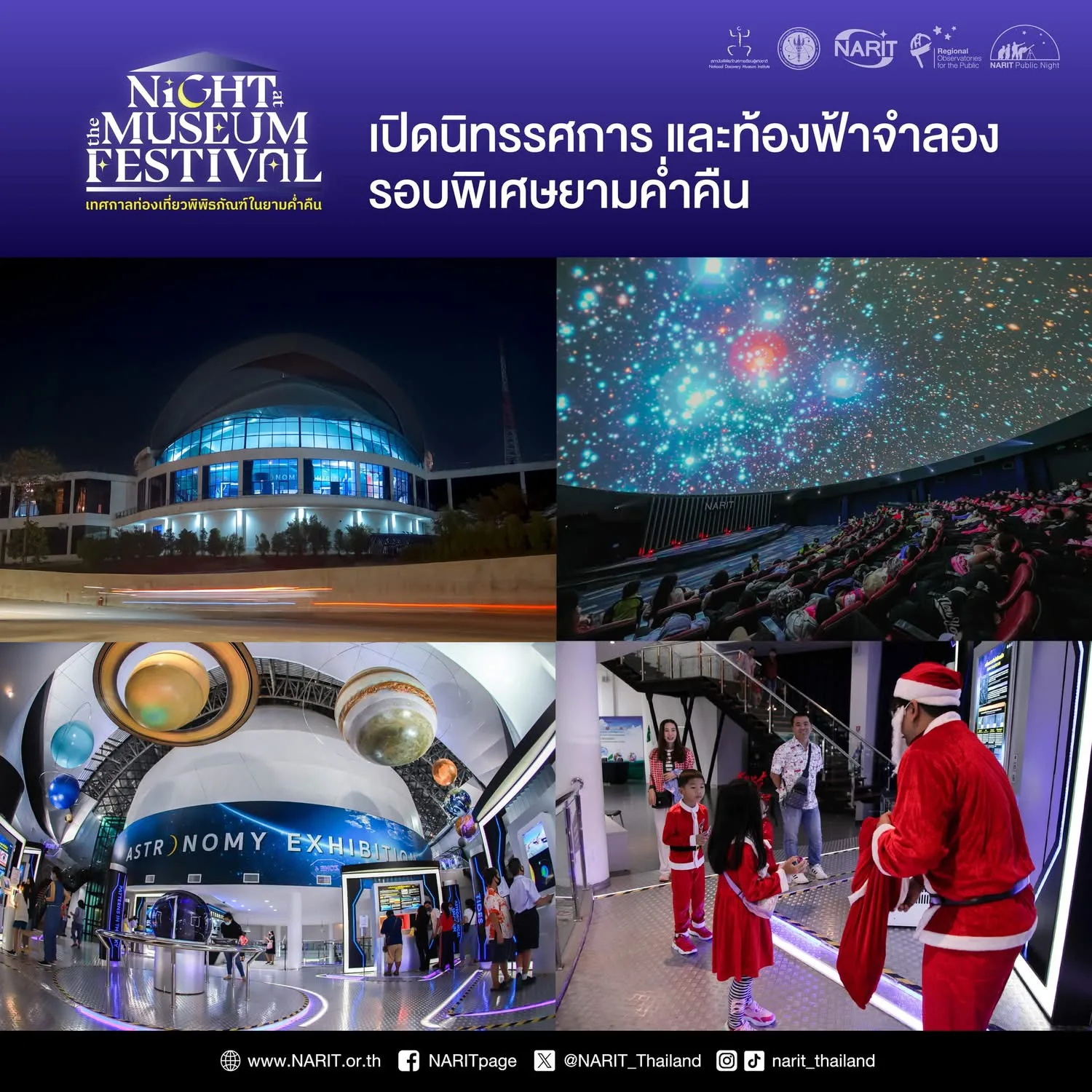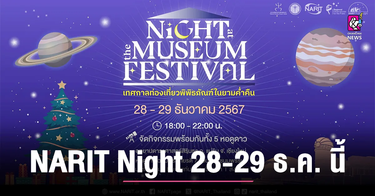 สถาบันวิจัยดาราศาสตร์แห่งชาติ (องค์การมหาชน) (สดร. หรือ NARIT) กระทรวงการอุดมศึกษา วิทยาศาสตร์ วิจัยและนวัตกรรม (อว.) เปิดให้เข้าชมนิทรรศการ และท้องฟ้าจำลองรอบพิเศษยามค่ำคืน ส่งท้ายเทศกาลคริสต์มาส และเตรียมเฉลิมฉลองต้อนรับปีใหม่ ในงาน NARIT Night at the Museum Festival 2024 วันที่ 28 – 29 ธันวาคม 2567 เวลา 10:00 – 22:00 น. ณ อุทยานดาราศาสตร์สิรินธร อ.แม่ริม จ.เชียงใหม่ และหอดูดาวภูมิภาคสำหรับประชาชนทั้ง 4 แห่ง ที่นครราชสีมา ขอนแก่น ฉะเชิงเทรา และสงขลา