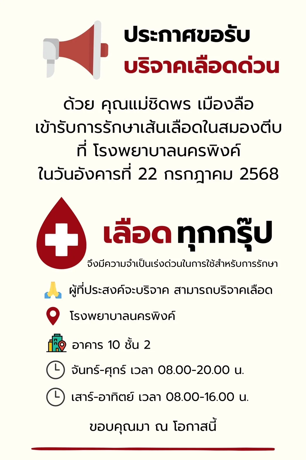 📣ประกาศขอรับบริจาคเลือดด่วน
