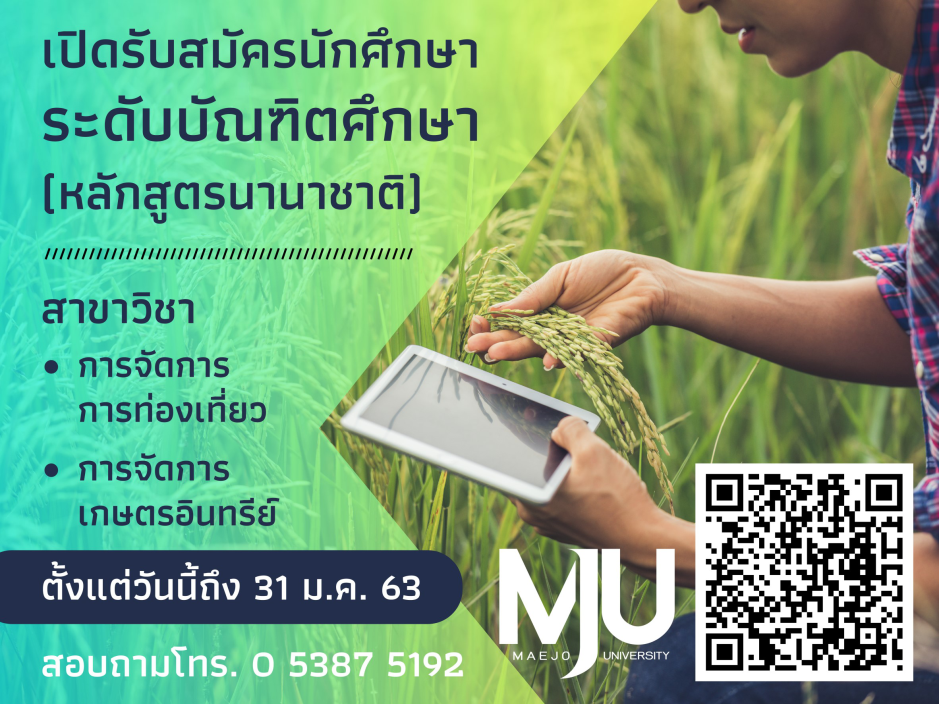 วิทยาลัยนานาชาติ มหาวิทยาลัยแม่โจ้ เปิดรับสมัครเข้าศึกษาต่อระดับบัณฑิตศึกษา หลักสูตรนานาชาติ ทั้งปริญญาโท และปริญญาเอก ประจำปีการศึกษา 2563 ตั้งแต่บัดนี้ จนถึงวันที่ 31 มกราคม 2563 ผศ.พาวิน มะโนชัย รักษาการแทนคณบดีวิทยาลัยนานาชาติ กล่าวว่า “วิทยาลัยนานาชาติ มีพันธกิจในการผลิตบัณฑิตที่มีความรู้ความสามารถ และทักษะในระดับนานาชาติทางด้านการเกษตร ตอบสนองนโยบายการพัฒนาประเทศ และยุทธศาสตร์การพัฒนามหาวิทยาลัยแม่โจ้ในการขยายโอกาสทางการศึกษาทั้งในประเทศและต่างประเทศ ผลิตผลงานวิจัยด้านการเกษตรและที่เกี่ยวข้องร่วมกับเครือข่ายความร่วมมือระหว่างประเทศ พร้อมให้บริการวิชาการและแสวงหาความร่วมมือทางวิชาการด้านการจัดการหลักสูตรฝึกอบรมนานาชาติร่วมกับสถาบันการศึกษาและหน่วยงานอื่น ๆ ทั้งภาครัฐและเอกชน รวมทั้งเสริมสร้างความรู้และนวัตกรรม เพื่อพัฒนาการเกษตรที่ยั่งยืนตลอดจนเผยแพร่หลักปรัชญาเศรษฐกิจพอเพียง พระบาทสมเด็จพระบรมชนกาธิเบศร มหาภูมิพลอดุลยเดชมหาราช บรมนาถบพิตร จนก่อให้เกิดความเจริญของชุมชนท้องถิ่น และสังคมให้เป็นที่ประจักษ์จนเป็นที่ยอมรับของประชาชนและประชาคมโลกโดยผ่าน การวิจัยและบริการวิชาการที่มีประสิทธิภาพนั่นเอง รวมถึงการสนับสนุนและบริหารจัดการหลักสูตรนาชาติ การวิจัย และบริการวิชาการเพื่อมุ่งสู่ความเป็นนานาชาติ ร่วมกับเครือข่ายความร่วมมือทั้งในและต่างประเทศ ในลักษณะของ One Stop Service Center โดยในปีการศึกษา 2563 ได้เปิดรับสมัครนักศึกษาระดับบัณฑิตศึกษา ทั้งระดับปริญญาโท และปริญญาเอก จำนวน 4 หลักสูตร 2 สาขาวิชา ได้แก่ สาขาวิชาการจัดการท่องเที่ยว และ สาขาวิชาการจัดการเกษตรอินทรีย์ ซึ่งเป็นหลักสูตรที่น่าสนใจเป็นอย่างยิ่ง”