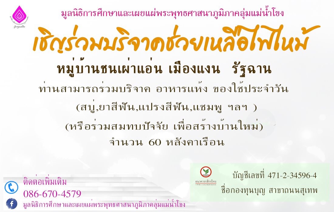 มูลนิธิการศึกษาและเผยแผ่พระพุทธศาสนาภูมิภาคลุ่มแม่น้ำโขง วัดสวนดอก พระอารามหลวง ขอเชิญญาติธรรมทุกท่าน ร่วมบริจาคปัจจัย อาหารแห้ง ของใช้ประจำวัน ยารักษาโรค เพื่อช่วยเหลือพี่น้อง กลุ่มชาติพันธุ์แอ่นที่ประสบอัคคีภัย ที่เมืองแงน เชียงตุง รัฐฉาน ท่านสามารถนำสิ่งของร่วมทำบุญได้ที่ มูลนิธิการศึกษาและเผยแผ่พระพุทธศาสนาภูมิภาคลุ่มแม่น้ำโขง (ห้อง Monk Chat) วัดสวนดอก ต.สุเทพ อ.เมือง จ.เชียงใหม่ โทร 086-6704579 หรือ บัญชีกองทุนบุญ 471-2-34596-4 กสิกรไทย