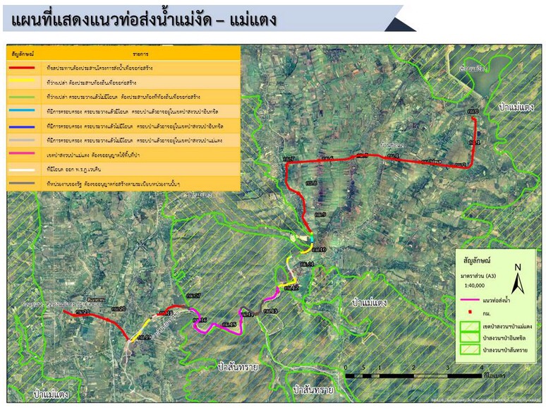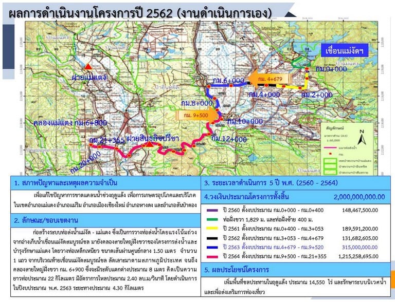 นายจรินทร์ คงศรีเจริญ ผู้อำนวยการ โครงการชลประทานเชียงใหม่ กล่าวว่า จากปัญหาภัยแล้งและการขาดแคลนน้ำ ในห้วงฤดูแล้งของคลองส่งน้ำชลประทานแม่แตง สำนักงานก่อสร้างชลประทาน ขนาดใหญ่ที่ 1 ตำบลสันโป่ง อำเภอแม่ริม จังหวัดเชียงใหม่ ได้ดำเนินการก่อสร้างวางท่อส่งน้ำ จากเขื่อนแม่งัดสมบูรณ์ชล อำเภอแม่แตง ขนาด 1.50 เมตร จำนวน 1 เส้น ด้วยงบประมาณ 2 พันล้านบาท ดำเนินการตั้งแต่ปี 60 ซึ่งตามกำหนดแล้วเสร็จในปี 2564 การดำเนินงานคืบหน้าไปอย่างต่อเนื่อง ของการขุดวางท่อส่งน้ำ ในปี 2563 จะมีการปรับเปลี่ยนเป็นการจ้างเหมา เพื่อให้งานเดินหน้าเร็วขึ้น สามารถใช้งานได้ตามกำหนด ซึ่งจะช่วยแก้ไขปัญหาภัยแล้งในฝั่งทิศตะวันตก โดยนำน้ำจากธนาคารน้ำเขื่อนแม่งัด นำมาฝากไว้ในห้วงฤดูฝน ก่อนจะส่งใช้ในห้วงฤดูแล้ง เนื่องจากลำน้ำแม่แตงไม่มีอ่างกักเก็บน้ำ ส่งผลให้ช่วงฤดูฝนจะระบายลงไปแม่น้ำปิงโดยตรง