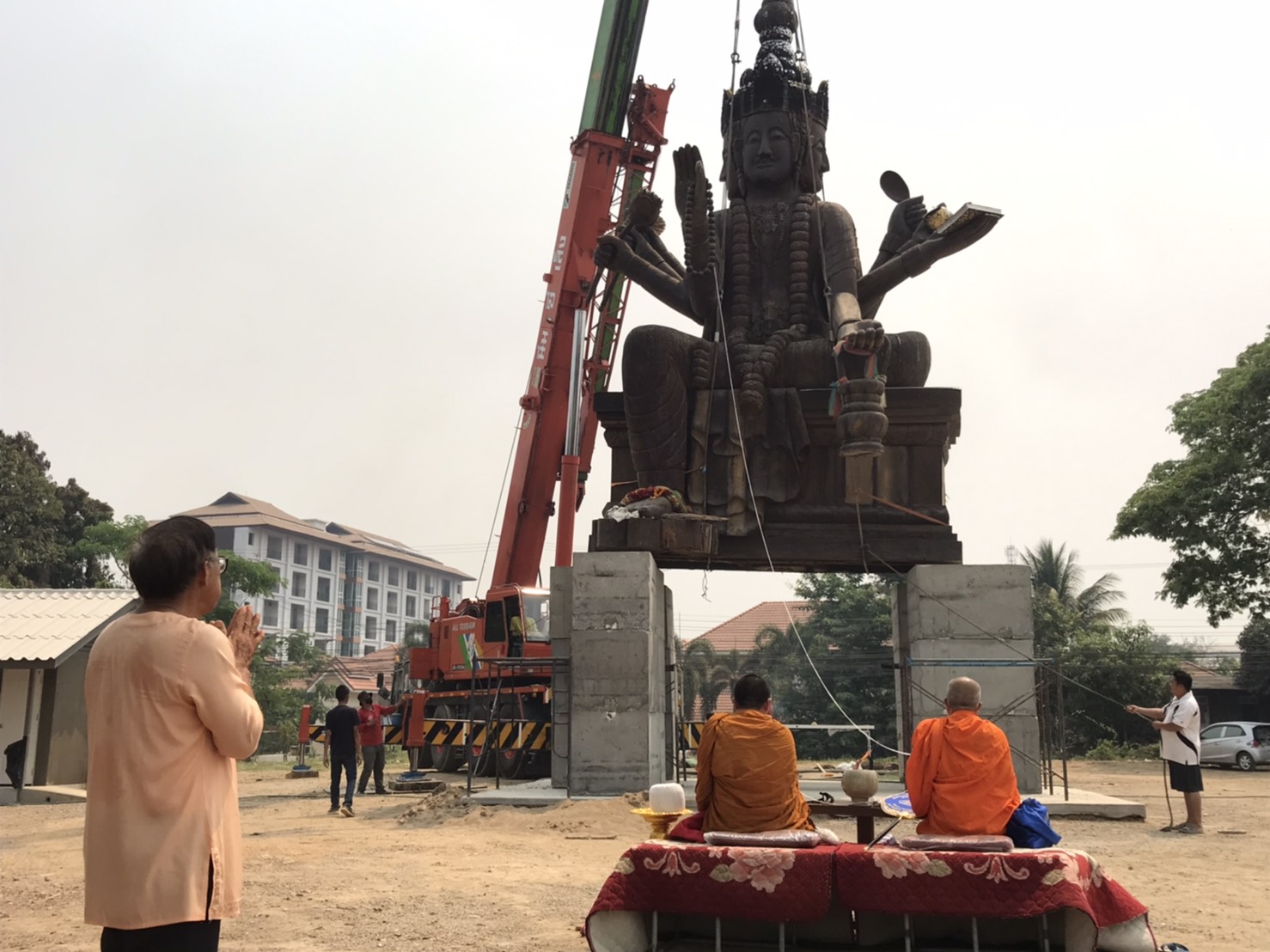 วันนี้นั้นได้นิมนต์พระสงฆ์จำนวน 2 รูป อัญเชิญยกองค์ท้าวมหาพรหม และพญาช้างเอราวัณ ได้เริ่มมาตั้งแต่ช่วงเช้าโดยมีการเตรียม เครน 100 ตัน พร้อมทีมงาน เวลา 10.00 น. ยกองค์ท้าวมหาพรหมขึ้นประทับบนแท่นฐานก่อน จากนั้นอัญเชิญยกพญาช้างเอราวัณขึ้นประทับบนแท่นฐานต่อไป