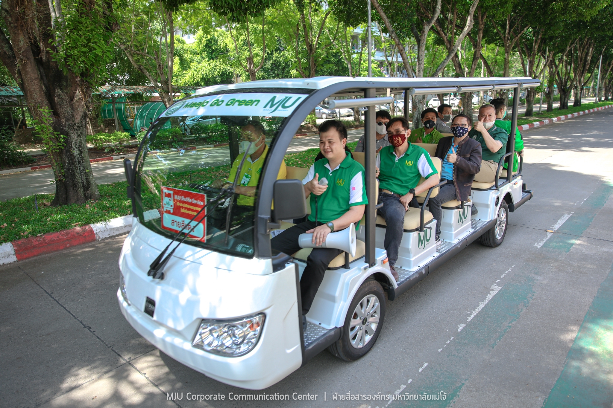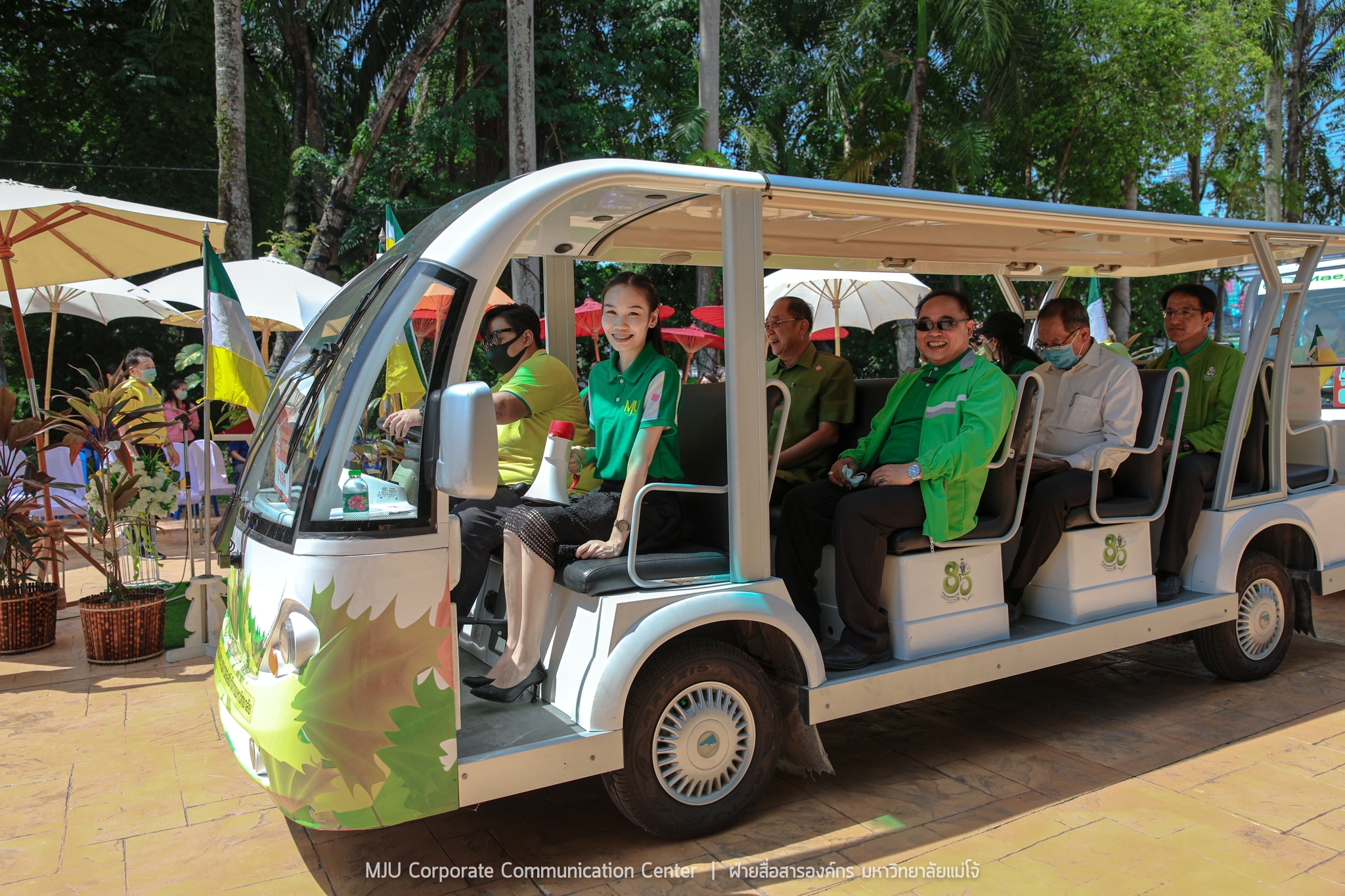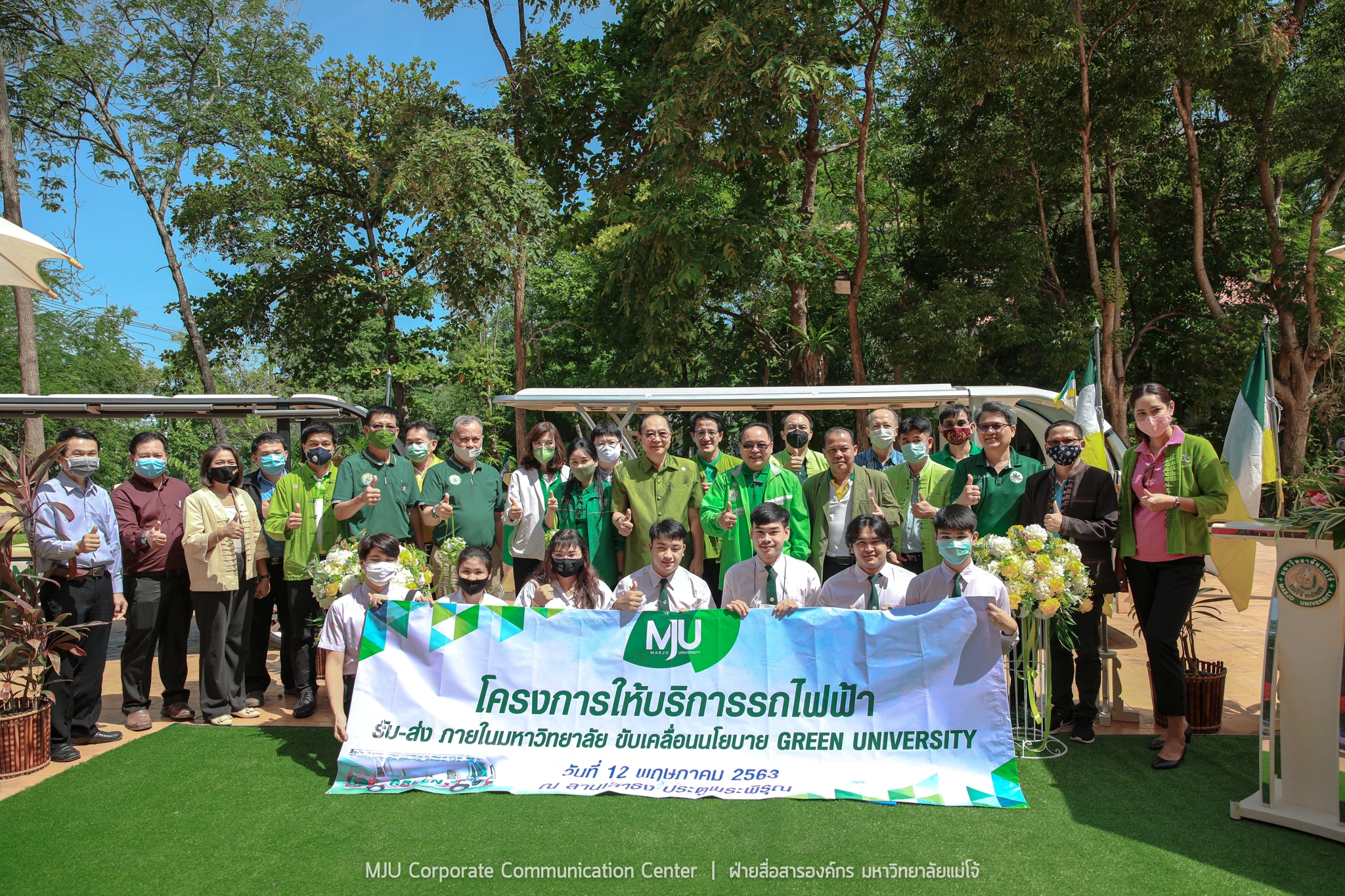 วันอังคารที่ 12 พฤษภาคม 2563 ดร.กษิต พิสิษฐ์กุล รองประธานกรรมการส่งเสริมกิจการมหาวิทยาลัยแม่โจ้ เป็นประธานในพิธีเปิดทดลองให้บริการรถไฟฟ้ารับ-ส่ง ภายในมหาวิทยาลัย ขับเคลื่อนนโยบาย Green University เพื่อความสะดวก ปลอดภัย ลดอุบัติเหตุ ลดการใช้รถยน์ รถจักรยานยนต์ และลดการปล่อยก๊าซเรือนกระจกในพื้นที่มหาวิทยาลัย อำนวยความสะดวกให้กับบุคลากรและนักศึกษา โดยมี รองศาสตราจารย์ ดร.วีระพล ทองมา อธิการบดีมหาวิทยาลัยแม่โจ้ พร้อมด้วย คณะผู้บริหาร คณาจารย์ บุคลากร และผู้นำองค์กรนักศึกษา เข้าร่วมพิธี ณ บริเวณลานเสาธงประตูพระพิรุณ มหาวิทยาลัยแม่โจ้