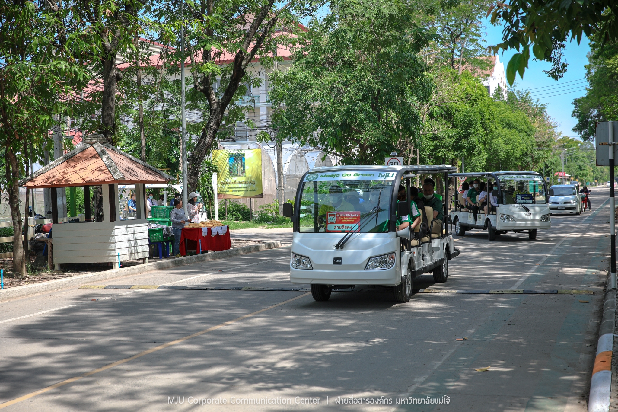 Shuttle service มหาวิทยาลัยแม่โจ้ จะมีรถบริการ รวม 4 คัน ประกอบด้วย รถกอล์ฟไฟฟ้า ขนาด 15 ที่นั่ง จำนวน 2 คัน รถไฟฟ้า ขนาด 14 ที่นั่ง จำนวน 1 คัน และ ขนาด 6 ที่นั่ง 1 คัน ให้บริการ 2 ช่วงเวลา คือ ช่วงที่ 1 เปิดให้บริการตั้งแต่เวลา 08.30 – 10.30 น. / ช่วงที่ 2 เปิดให้บริการตั้งแต่เวลา 13.00 – 16.30 น. จัดเส้นทางการเดินรถ จำนวน 2 เส้นทาง คือ