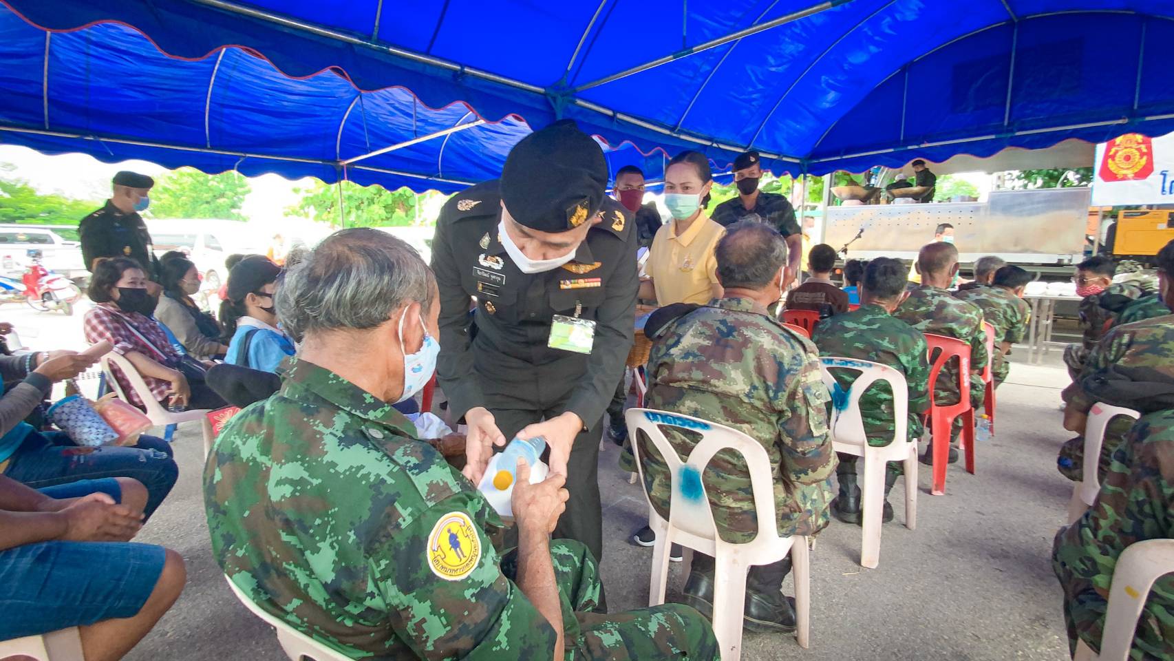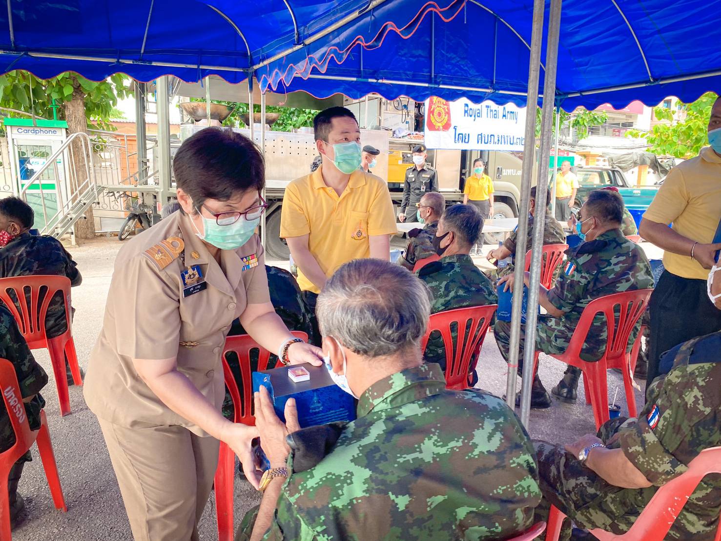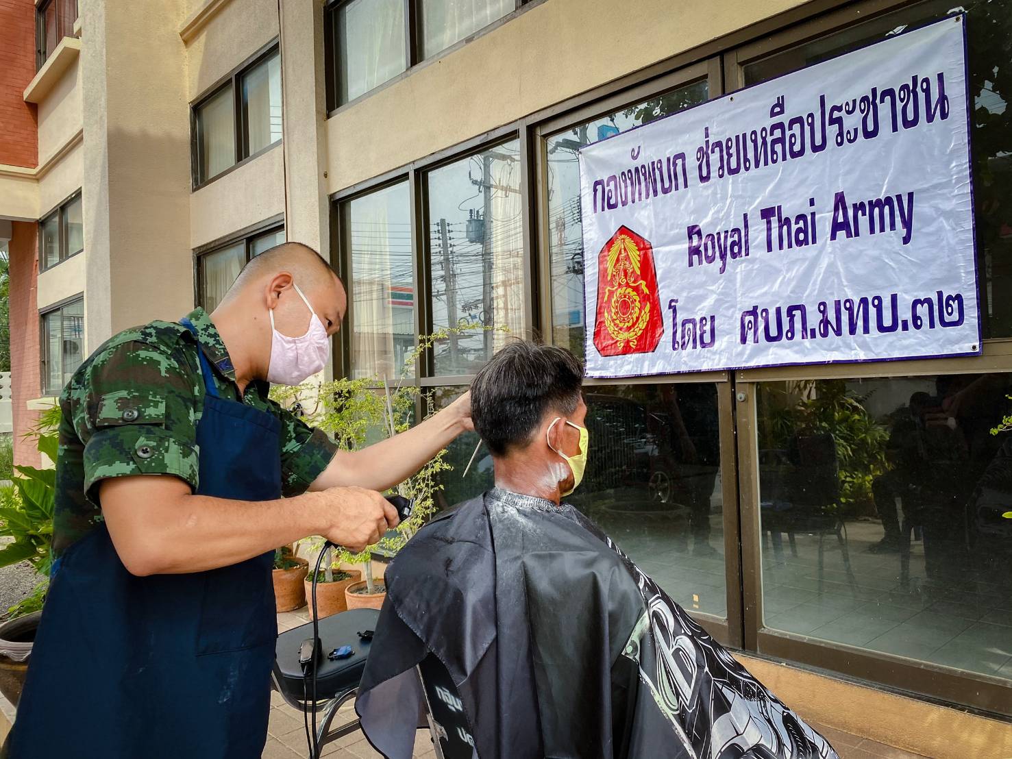 วันที่ 27 ก.ค. 63 ผบ.มทบ.32 ร่วมกับ นายอำเภอแม่ทะ , การไฟฟ้าฝ่ายผลิตแห่งประเทศไทย (กฟผ.แม่เมาะ) จัดรถครัวสนามแจกจ่ายอาหารกล่อง น้ำดื่มน้ำใจ จำนวน 350 ชุด ให้ประชาชนที่ได้รับผลกระทบจากโควิด-19 และครอบครัวและญาติๆ ของทหารกองเกินที่เข้ารับการตรวจเลือกเป็นทหารกองประจำการ ณ ที่ว่าการอำเภอแม่ทะ จังหวัดลำปาง พร้อมจัดหน่วยแพทย์เคลื่อนที่ ให้บริการทางการแพทย์ โดยมีผู้เข้ารับบริการ 31 ราย และบริการตัดผมฟรี มีผู้เข้ารับบริการ 12 ราย