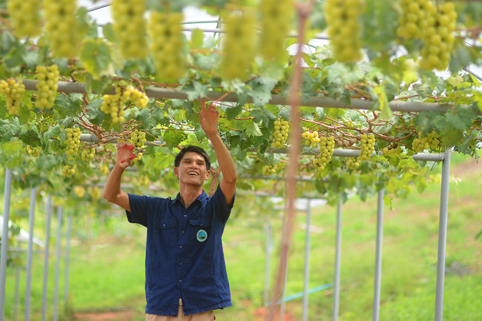 จุดเริ่มต้นจาก “สวนน้องเฟรนท์ฟราย” มี นายศุภฤกษ์ บุญประสบณ์ ประธานกลุ่มเกษตรอินทรีย์บ้านหมากแข้ง ต้อนรับบอกเล่าความเป็นมาของกลุ่ม โปรแกรมท่องเที่ยวภายในชุมชนป่าต้นน้ำที่สำคัญ แล้วไปท่องเที่ยวกันชมสวนองุ่นสวย ๆ ของ นายเอกพล ราศรีโย เกษตรผู้ปลูกองุ่นไร้เมล็ดพันธุ์ องุ่นพันธุ์ บิวตี้ซิดเลส(Beauty Seedless) เป็นองุ่นไม่มีเมล็ด ทรงผลรี มีขนาดปานกลาง สีดำ ช่อใหญ่ ออกดอกติดผลง่าย รสชาติอร่อย หวานกรอบ เป็นที่นิยมของผู้บริโภค บนพื้นที่ขนาด 1 ไร่ ปลูกองุ่น 70 ต้น สร้างรายได้ 304,500 บาทต่อปี