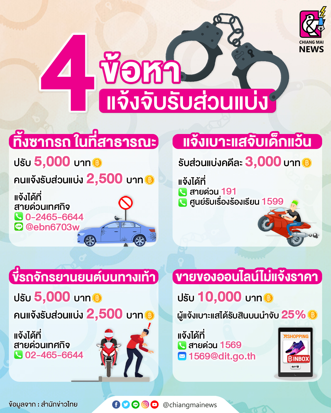 มาเป็นหูเป็นตาเพื่อสร้างระเบียบวินัยในสังคม กับ 4 ข้อหา คนแจ้งเบาะแสได้ส่วนแบ่งค่าปรับมากถึง 50% ทั้งข้อหาทิ้งซากรถ ในที่สาธารณะ แจ้งเบาะแสจับเด็กแว้น หรือที่พบเจอกันได้บ่อยที่สุดในสังคมไทยขณะนี้ คือ ขี่จักรยานยนต์บนทางเท้า ขายของออนไลน์ไม่แจ้งราคา ส่วนใครที่กำลังเข้าข่ายกำลังจะกระทำความผิด 4 ข้อนี้ ระวังโดนแจ้งจับนะคะ