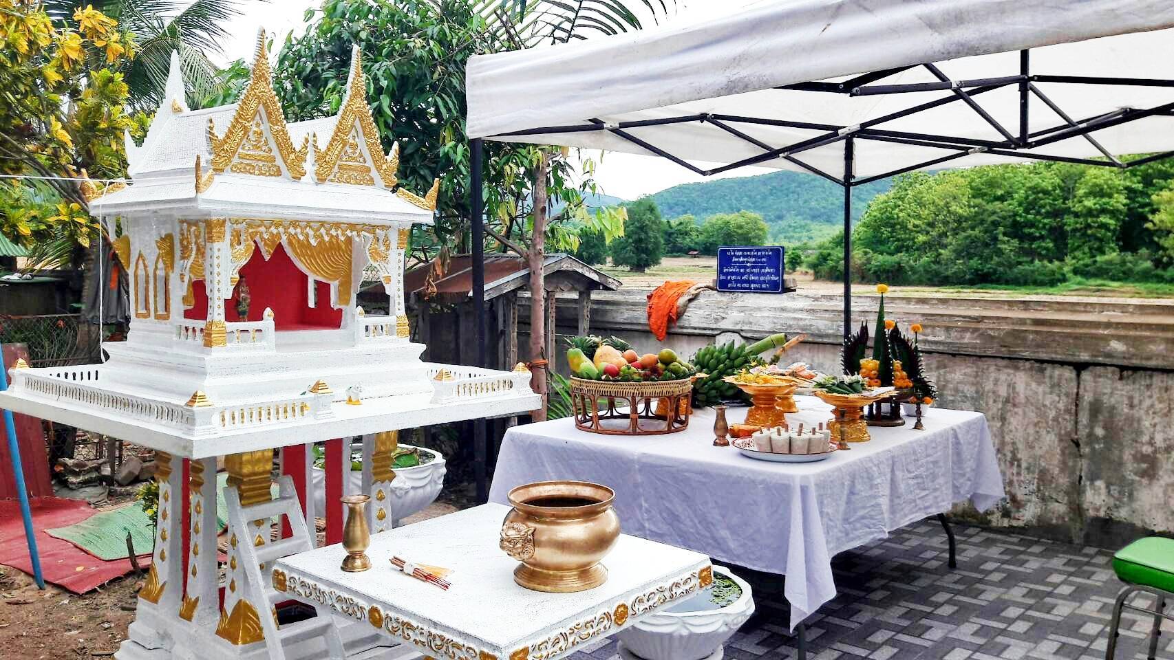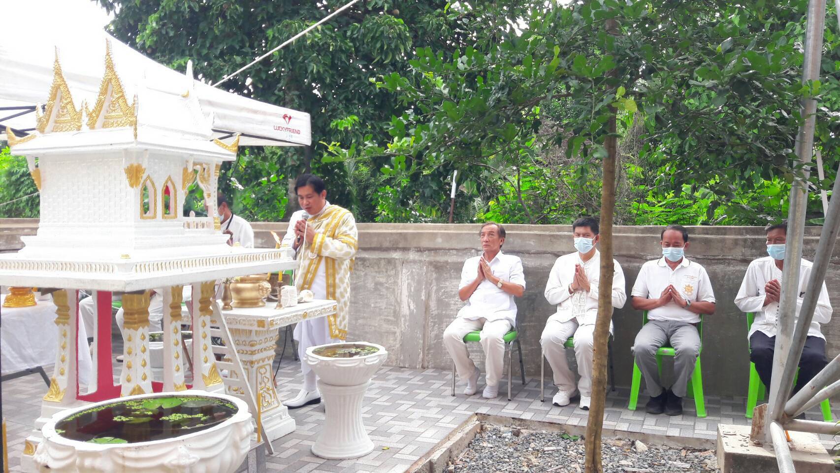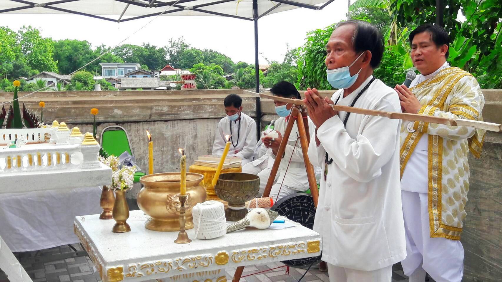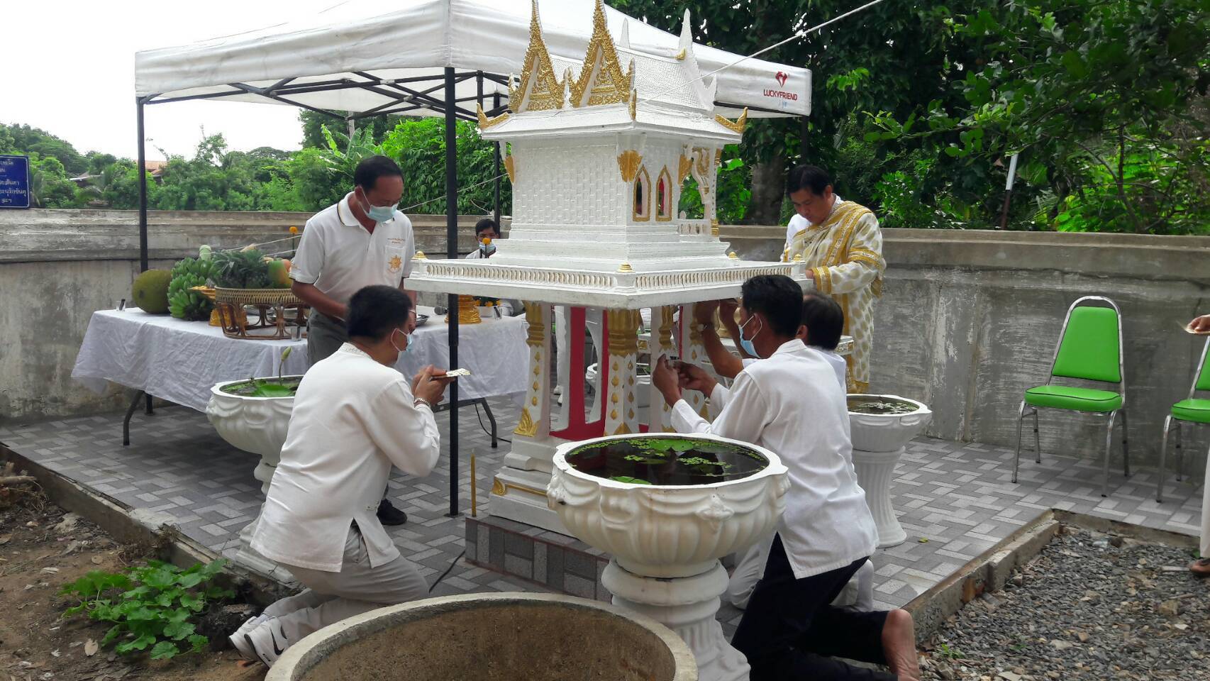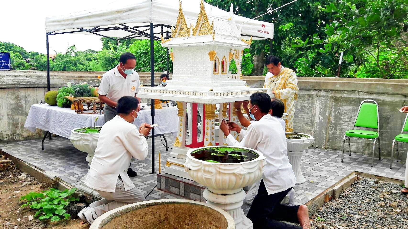 จึงได้จัดทำพิธีอัญเชิญสิ่งศักดิ์สิทธิ์มาสิงสถิตย์ยังหอแห่งนี้ ช่วงเช้าทำพิธีทางศาสนาฝ่ายสงฆ์ ช่วงสายทำพิธีพราหมณ์ เสร็จแล้ว จึงได้ทำพิธีเสี่ยงทายว่ารุกขเทวดาสิ่งศักดิ์สิทธิ์ ได้มาสิงสถิตอยู่สถานที่นี้หรือยัง โดยการนำไม้ไผ่ยาวสองช่วงแขนของผู้ทำมีขนาดพอดีสุดปลายนิ้ว โดยให้ทุกคนในวัดที่มาร่วมทำพิธีได้ดู แล้วอธิษฐานว่าหากรุกขเทวดาสิ่งศักดิ์สิทธิ์ได้มาสิงสถิตย์ยังที่แห่งนี้แล้ว ขอให้ไม้วัดอันนี้จงยืดออกไป หากยังไม่มาขอให้ไม้วัดอันนี้ จงอยู่เท่าเดิม ปรากฎว่าไม้ที่นำมาเสี่ยงทายได้ขยายออกไป 3 นิ้ว ทำให้ทุกคนที่เห็นกับตาตัวเองแปลกใจมาก และเชื่อว่าได้มีเทวดาสิ่งศักดิ์สิทธิ์มาสิงสถิตย์อยู่จริง จึงได้ยกมือขึ้นสาธุพร้อมกัน
