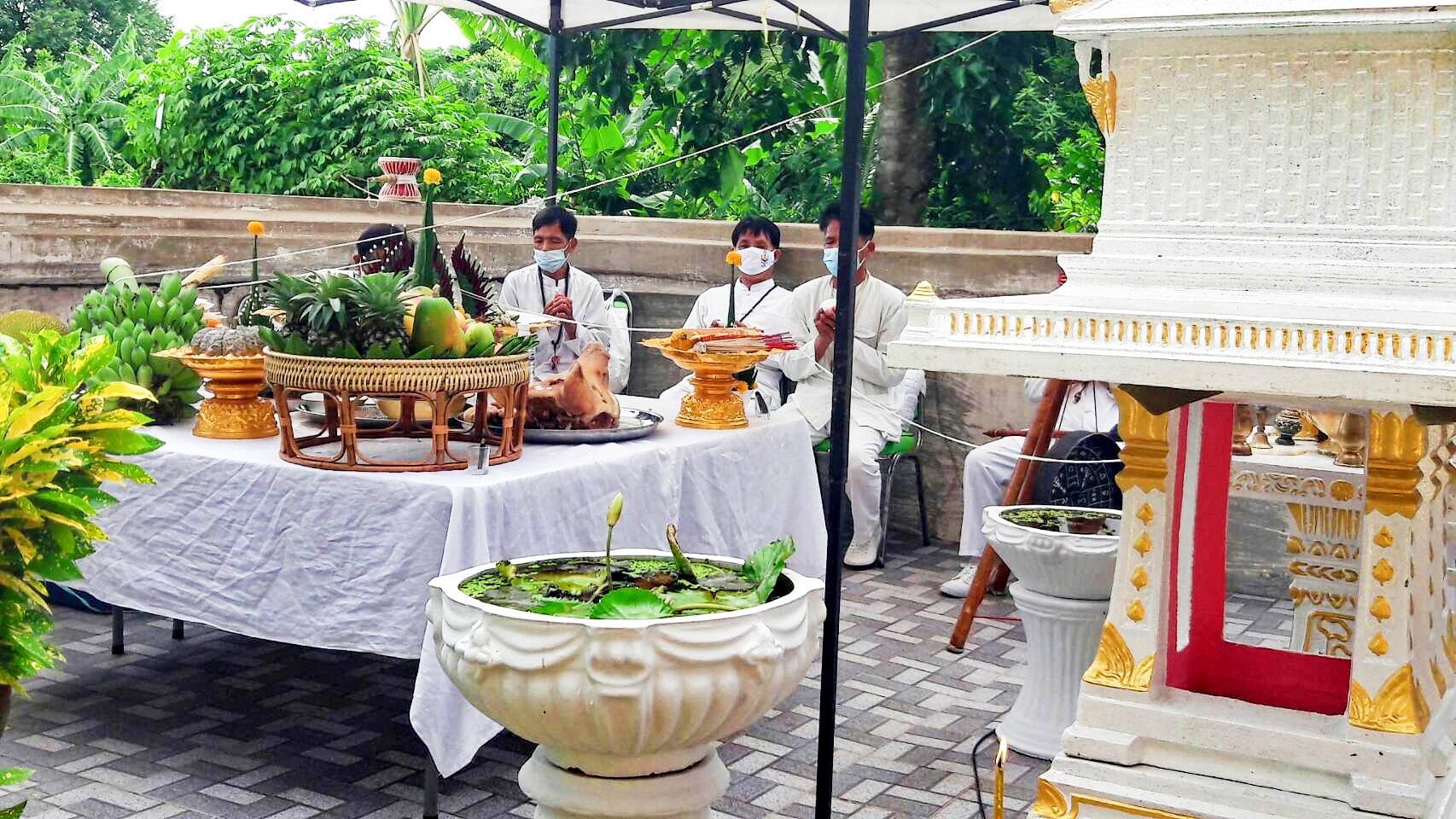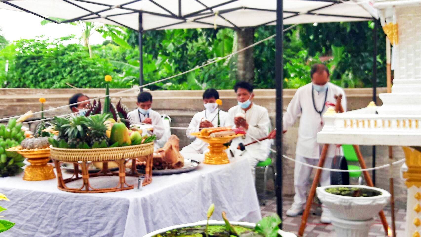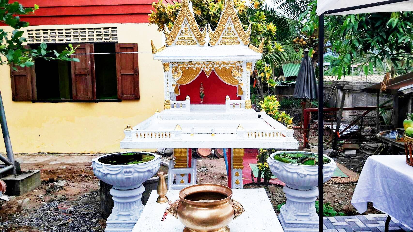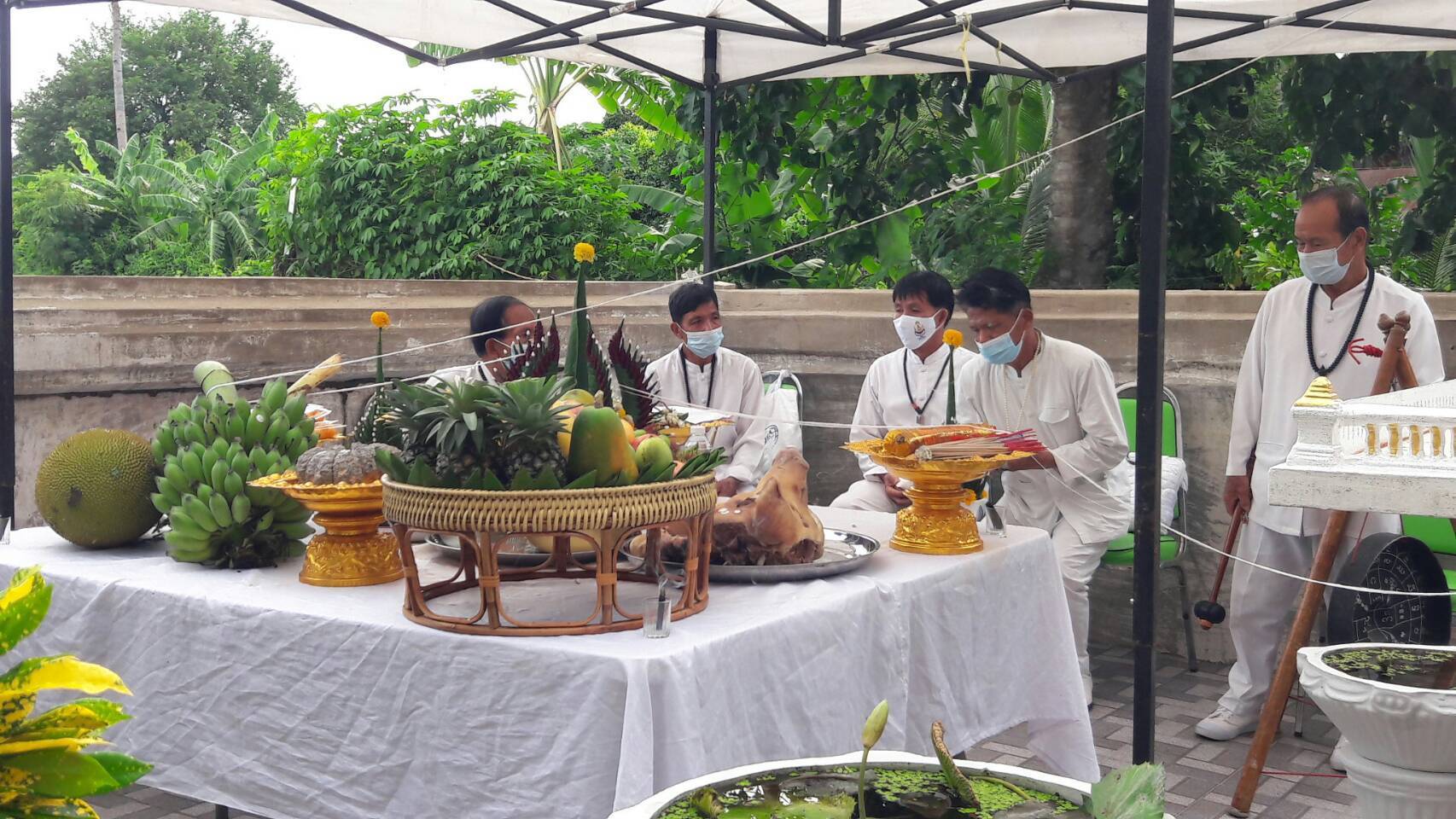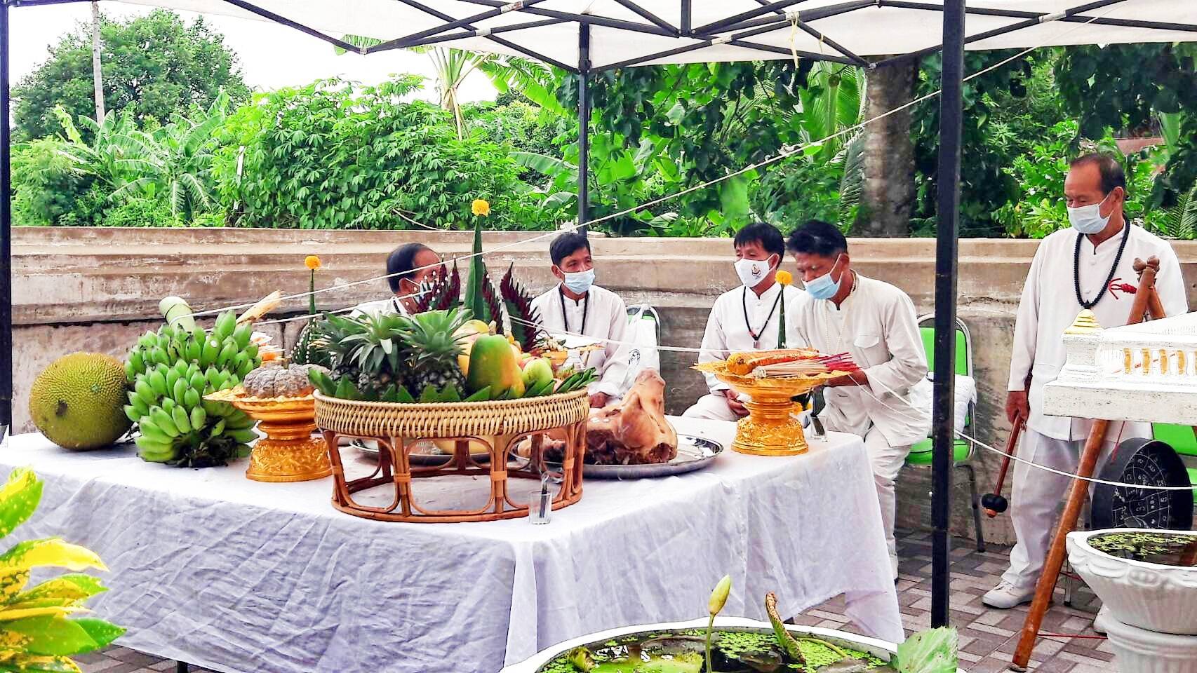 จึงได้จัดทำพิธีอัญเชิญสิ่งศักดิ์สิทธิ์มาสิงสถิตย์ยังหอแห่งนี้ ช่วงเช้าทำพิธีทางศาสนาฝ่ายสงฆ์ ช่วงสายทำพิธีพราหมณ์ เสร็จแล้ว จึงได้ทำพิธีเสี่ยงทายว่ารุกขเทวดาสิ่งศักดิ์สิทธิ์ ได้มาสิงสถิตอยู่สถานที่นี้หรือยัง โดยการนำไม้ไผ่ยาวสองช่วงแขนของผู้ทำมีขนาดพอดีสุดปลายนิ้ว โดยให้ทุกคนในวัดที่มาร่วมทำพิธีได้ดู แล้วอธิษฐานว่าหากรุกขเทวดาสิ่งศักดิ์สิทธิ์ได้มาสิงสถิตย์ยังที่แห่งนี้แล้ว ขอให้ไม้วัดอันนี้จงยืดออกไป หากยังไม่มาขอให้ไม้วัดอันนี้ จงอยู่เท่าเดิม ปรากฎว่าไม้ที่นำมาเสี่ยงทายได้ขยายออกไป 3 นิ้ว ทำให้ทุกคนที่เห็นกับตาตัวเองแปลกใจมาก และเชื่อว่าได้มีเทวดาสิ่งศักดิ์สิทธิ์มาสิงสถิตย์อยู่จริง จึงได้ยกมือขึ้นสาธุพร้อมกัน