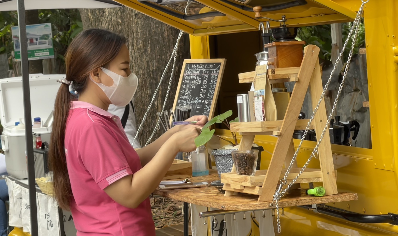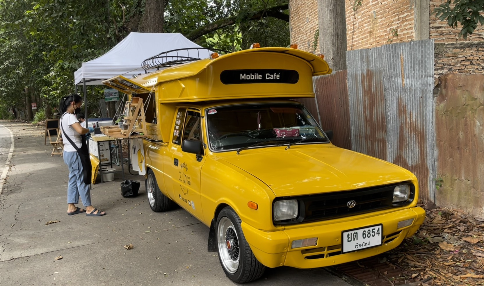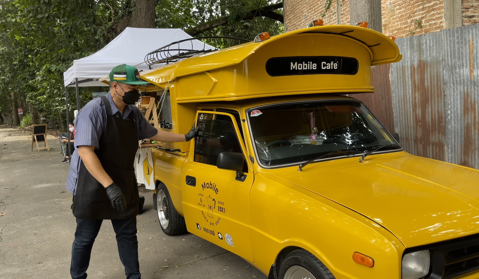 ส่วนร้านกาแฟดังกล่าวมีชื่อร้านว่า Mobile Cafe’ ที่มี นายจิรายุ ธนะหมี อายุ 40 ปี เป็นเจ้าของไอเดียรถกาแฟริมทางสุดเก๋ร้านนี้ ซึ่งเจ้าตัวได้มาตั้งร้านขายบริเวณดังกล่าวมาได้ประมาณ 3 สัปดาห์ จากที่ก่อนหน้านี้ตนได้ตระเวนขับรถขายกาแฟจามตัวเมืองเชียงใหม่มาประมาณ 1 เดือน จนกระทั่งมาเจอสถานที่แห่งนี้ จึงปักหลักขายกาแฟริมทางโดยมีแฟนสาวช่วยกันขาย ตั้งแต่เช้าเวลาประมาณ 08.00 น. จนถึงช่วงเย็นเวลาประมาณ 16.00 น. ซึ่งปรากฏว่าได้รับการตอบรับเป็นอย่างดี มากกว่าที่ไปขับตระเวนขายตามตัวเมืองเชียงใหม่ โดยที่เจ้าตัวคิดว่าสาเหตุที่ได้รับการตอบรับที่ดีนั้นเกิดจากโลเคชั่นสถานที่ที่ลงตัวและคอนเซ็ปท์ของร้านที่ลงตัว ทำให้มีลูกค้าสนใจ เดินทางมาใช้บริการกันเป็นจำนวนมาก