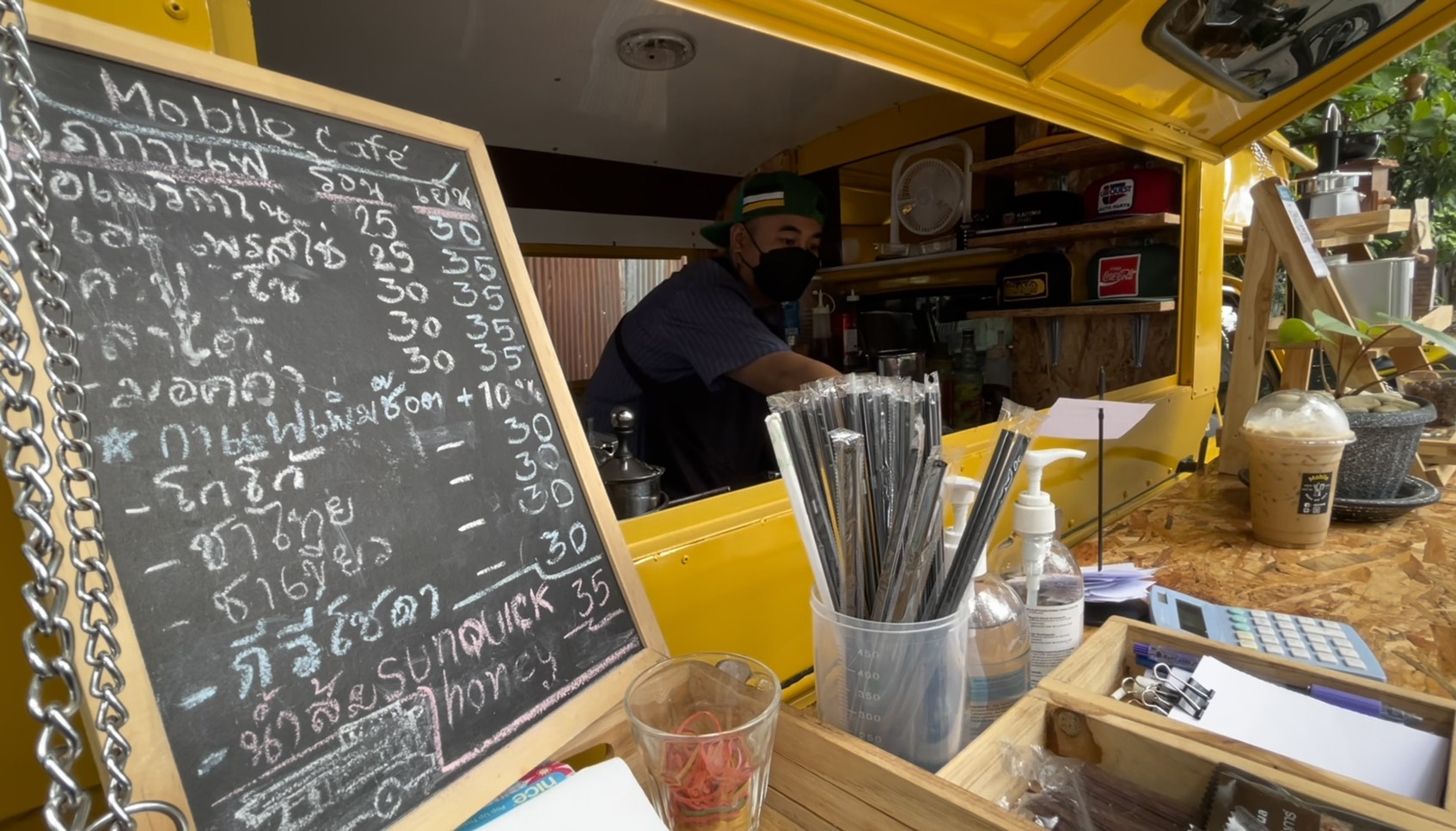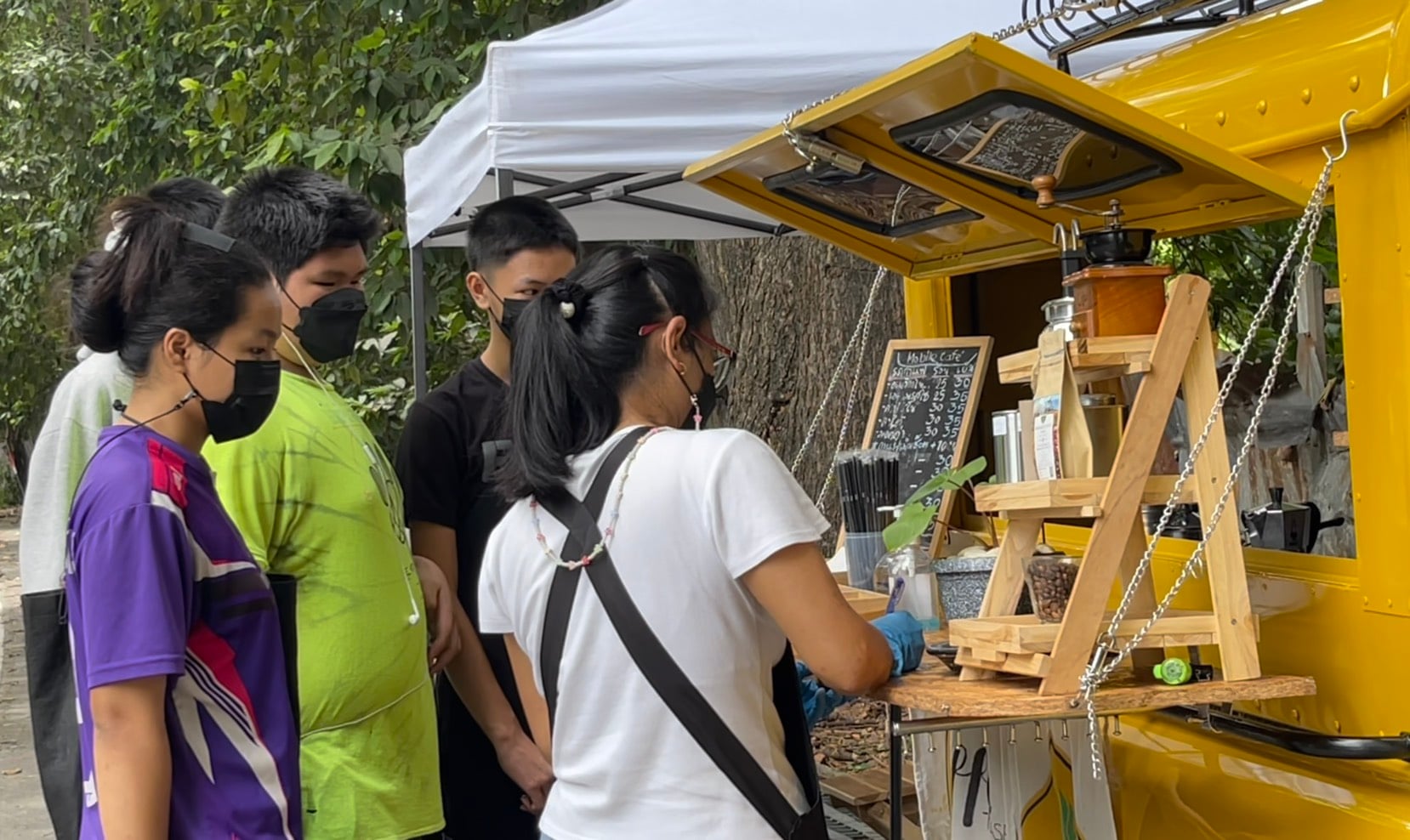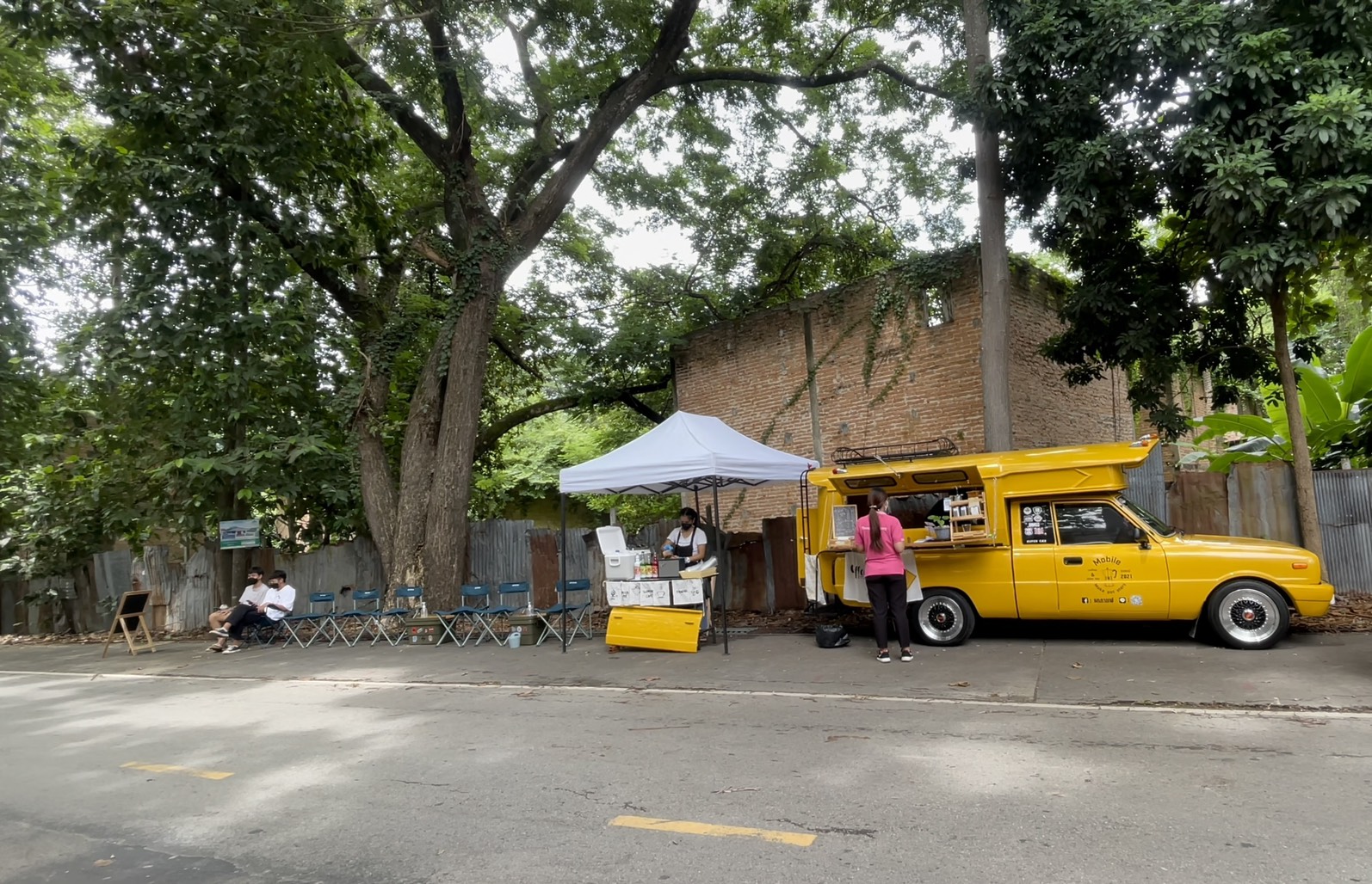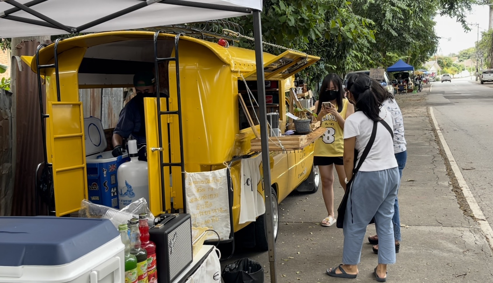 วันที่ 13 ส.ค.64 รายงานข่าวได้ทราบมาว่า ขณะนี้ที่บริเวณถนนด้านข้างสนามกีฬาเทศบาลตำบลดอยสะเก็ด อ.ดอยสะเก็ด จ.เชียงใหม่ ได้มีร้านกาแฟร้านหนึ่งเกิดขึ้น กลายเป็นแลนด์มาร์คและจุดเช็คอินที่กำลังได้รับความนิยมของบรรดากลุ่มวัยรุ่นและประชาชนที่ขับรถผ่านไปมาบริเวณดังกล่าวเป็นอย่างมาก จากการที่โลเคชั่นที่บริเวณดังกล่าวมีความร่มรื่น เย็นสบาย มีต้นไม้ใหญ่ ทำให้มีประชาชนแวะมานั่งพัก และพากันมาอุดหนุนร้านกันเป็นจำนวนมาก ส่วนรสชาตินั้นก็อร่อยไม่แพ้ร้านกาแฟชื่อดังหลายๆ ร้าน และราคากาแฟนั้นก็ไม่แพง อยู่ที่ราคาแก้วละ 30-35 บาท ซึ่งต่อมาทางผู้สื่อข่าวได้ลงพื้นที่ตามที่ทราบข้อมูลมา พบว่าที่จุดดังกล่าวมีร้านกาแฟที่เปิดเป็นรถกาแฟ ที่มีเอกลักษณ์เป็นรถสองแถวสีเหลือง หรือที่ประชาชนในพื้นที่รู้จักกันดีว่าเป็นรถโดยสารประจำอำเภอดอยสะเก็ด ซึ่งได้มีการดัดแปลงตกแต่งให้ด้านหลังรถกลายเป็นร้านขายกาแฟเก๋ๆ และมีม้านั่งใต้ต้นไม้คอยบริการให้กับลูกค้าและผู้ที่แวะเวียนมาอุดหนุนที่ร้าน โดยพบว่าตลอดทั้งวันมีคนพากันมาอุดหนุนนั่งดื่มกาแฟและถ่ายภาพกับโลเคชันแห่งนี้กันเป็นจำนวนมาก
