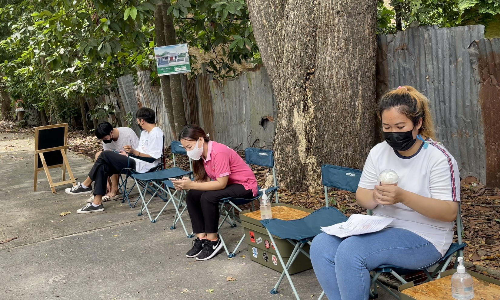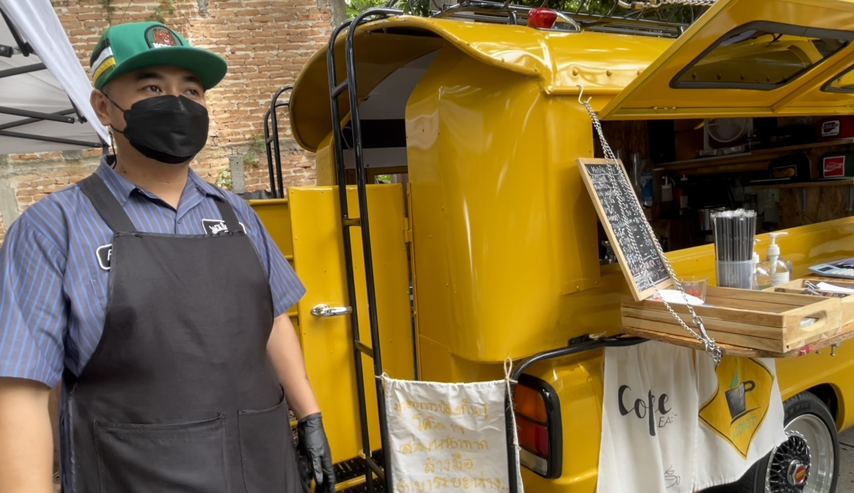 ส่วนบริเวณที่ขายทุกวันนี้ และกลายเป็นแลนด์มาร์ค ได้รับความสนใจและมีกระแสตอบรับที่ดีนั้นตนก็เพิ่งมาเจอเมื่อช่วง 3 สัปดาห์ก่อนหน้านี้เท่านั้น จากการที่ก่อนหน้านี้ตนขับรถไปขายกาแฟตามตัวเมืองเชียงใหม่ แต่จากการเกิดการระบาดของเชื้อโควิด-19 ก็ทำให้เจ้าของพื้นที่ต้องขอให้ตนหยุดขายไป และเริ่มหาโลเคชั่นที่จะตั้งร้านขายใหม่ จนกระทั่งมาทราบจากพี่ชายว่าที่บริเวณด้านข้างสนามกีฬาเทศบาลตำบลดอยสะเก็ด มีถนนด้านข้างที่ร่มรื่นเย็นสบาย ตนจึงมาสำรวจดูก็พบว่าตอบโจทย์กับการตั้งร้านของตน ประกอบกับมีองค์ประกอบที่ดีที่ตนรู้สึกชอบ ทำให้ตนตัดสินใจตั้งจุดขายกาแฟที่แห่งนี้ และต่อมามีประชาชนพากันแวะเวียนมาอุดหนุนก็เห็นว่าเป็นมุมถ่ายรูป นั่งพักผ่อนร่มรื่น กลายเป็นกระแสตอบรับที่ดีเกินคาด และตนก็มีความสุขกับการเปิดร้านบริเวณนี้ เพราะมีบรรดาคนรู้จัก และประชาชนทั่วไป แวะเวียนมาอุดหนุนตลอดทั้งวัน รวมทั้งตนก็ได้ทำในสิ่งที่ตั้งใจทำด้วย