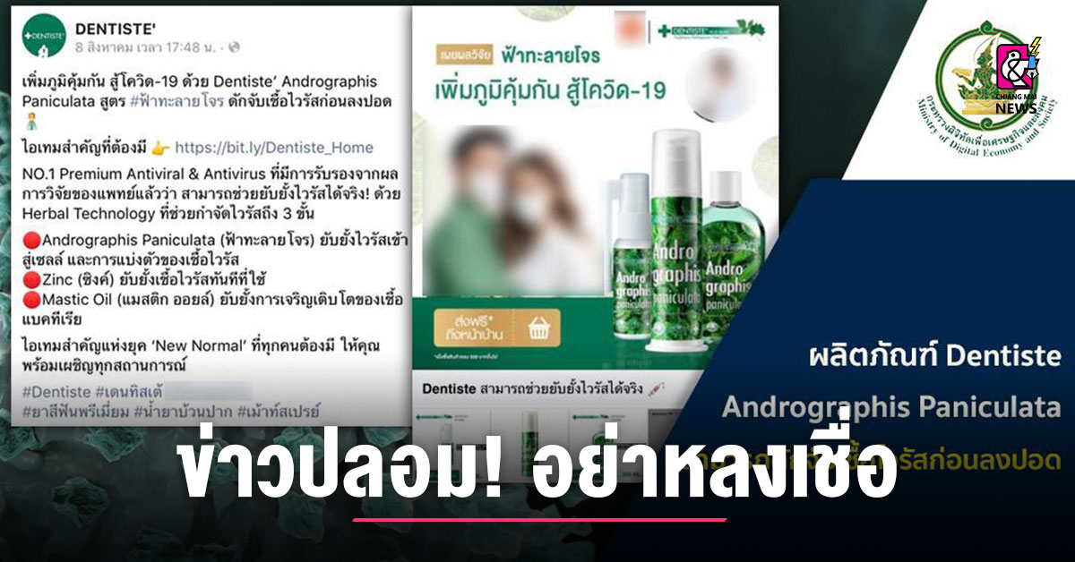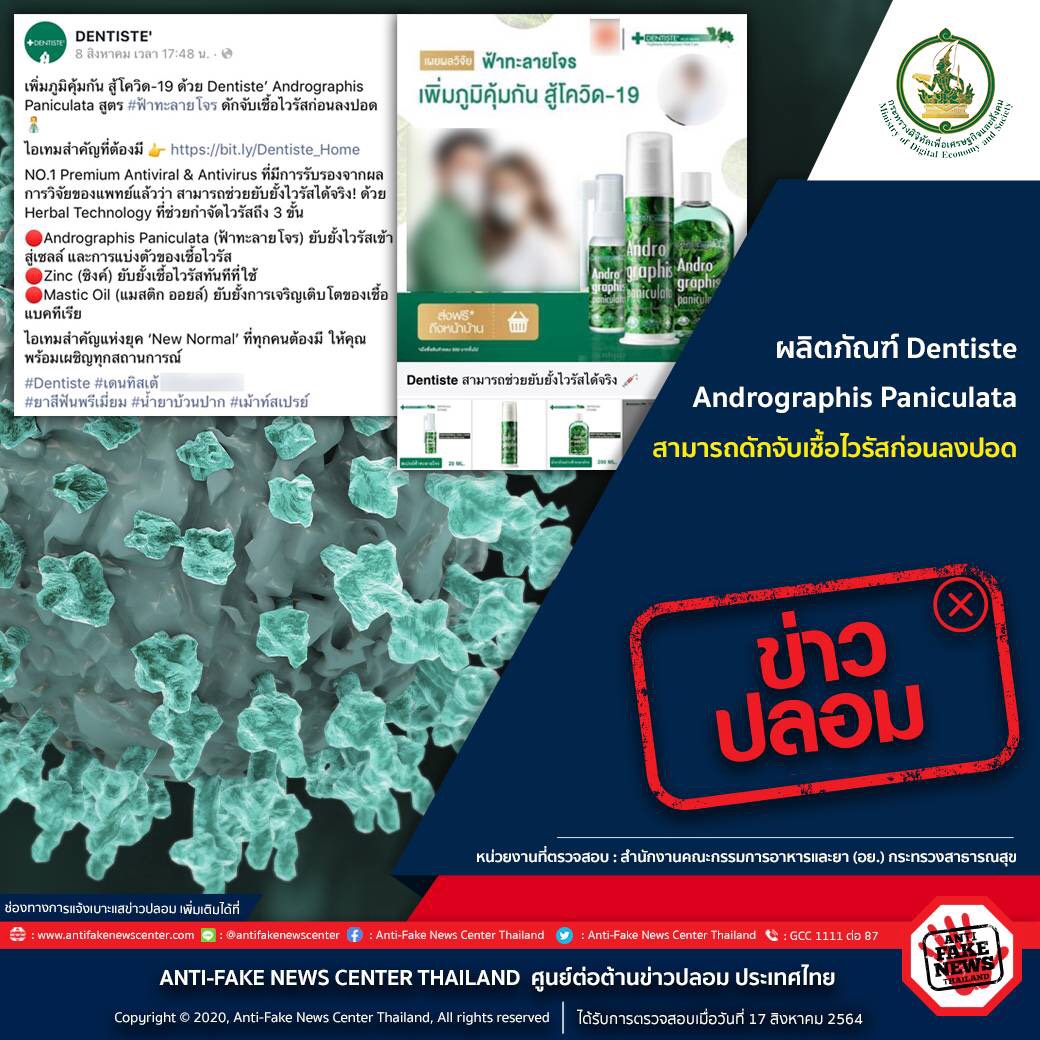 ผลิตภัณฑ์ Dentiste Andrographis Paniculata สามารถดักจับเชื้อไวรัสก่อนลงปอด นั้น ศูนย์ต่อต้านข่าวปลอมประเทศไทย ได้ตรวจสอบข้อเท็จจริง กับ สำนักงานคณะกรรมการอาหารและยา (อย.) กระทรวงสาธารณสุข พบว่าประเด็นดังกล่าวนั้น เป็นข้อมูลเท็จ