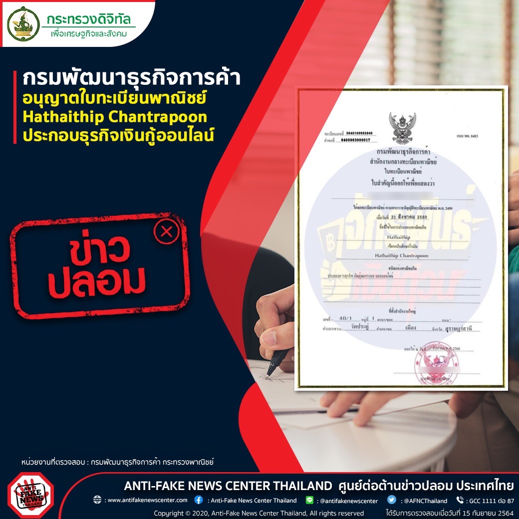 กรณีที่มีการเผยแพร่ใบอนุญาตจาก กรมพัฒนาธุรกิจการค้า อนุญาตใบทะเบียนพาณิชย์ Hathaithip Chantrapoon ประกอบธุรกิจเงินกู้ออนไลน์ ทางศูนย์ต่อต้านข่าวปลอม กระทรวงดิจิทัลเพื่อเศรษฐกิจและสังคม ได้ตรวจสอบข้อเท็จจริงกับทางกรมพัฒนาธุรกิจการค้า กระทรวงพาณิชย์ พบว่าข้อมูลดังกล่าวนั้น เป็นข้อมูลเท็จ