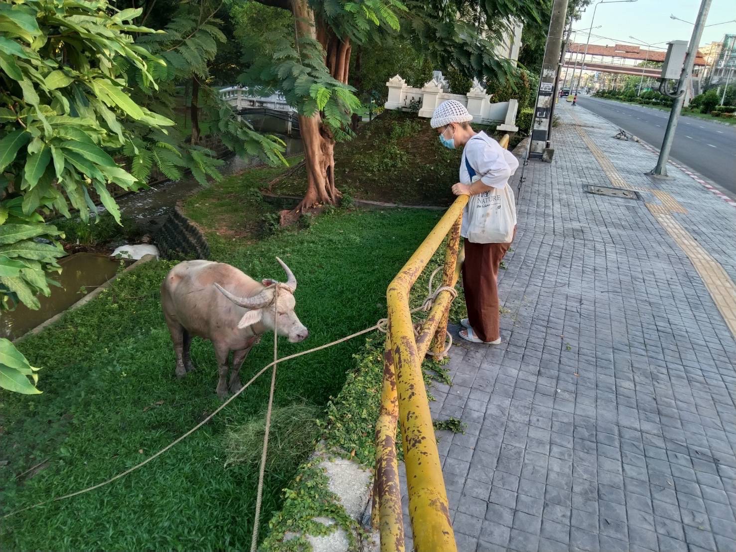 หลังจากนั้นพยายามขับรถติดตามควายเผือกเพื่อหาทางช่วยเหลือ ทราบว่าวิ่งไปหลายจุด ทั้งบริเวณแยกหนองหอย ต.หนองหอย จนสุดท้ายทราบว่าเจ้าหน้าที่กู้ภัยจับตัวไว้ได้ที่บริเวณสวนสาธารณะกาญจนาภิเษก บริเวณโค้งแจ่งกู่เฮือง อ.เมืองเชียงใหม่ ห่างจากปั๊มน้ำมันประมาณ 3 กิโลเมตร โดยเจ้าหน้าที่ที่ได้ใช้เชือกผูกไว้เพื่อป้องกันไม่ให้วิ่งหนีไปอีก