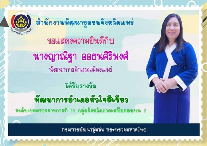 นายสุสังข์ ชุมมะโน พัฒนาการจังหวัดแพร่และข้าราชการในสังกัดขอแสเงความยินดีกับนางญาณิฐา ออธนศิรพงศ์ พัฒนาการอำเภอเมืองแพร่ ได้รับรางวัล พัฒนาการหัวใจสีเขียว ระดับเขตตรวจราชการที่ 16 กลุ่มจังหวัดภาคเหนือตอนบน 2