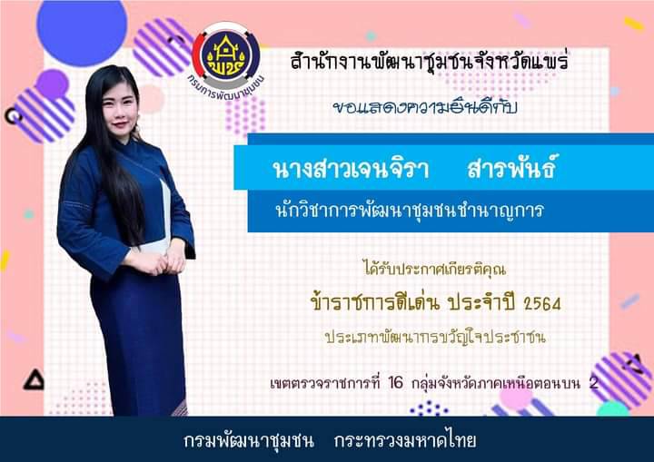 นางสาว เจนจิรา สารพันธ์ นักวิชาการพัฒนาชุมชนชำนาญการ สำนักงานพัฒนาชุมชนอำเภอเมืองแพร่ ได้รับประกาศเกียรติคุณข้าราชการดีเด่น กรมการพัฒนาชุมชน ประเภท พัฒนากรขวัญใจชุมชน เขตตรวจราชการที่ 16 กลุ่มจังหวัดภาคเหนือตอนบน 2