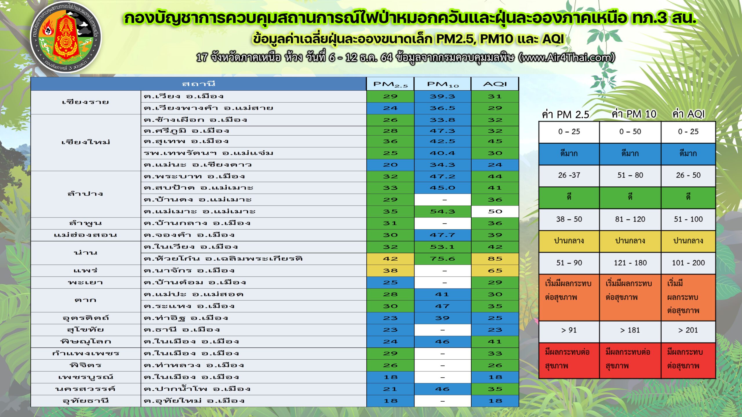 วันที่ 13 ธ.ค.64 พล.ต.ถนัดพล โกศัยเสวี รองแม่ทัพภาคที่ 3/รองผู้บัญชาการกองบัญชาการ ควบคุมไฟป่าหมอกควันและฝุ่นละอองภาคเหนือ กองทัพภาคที่ 3 ส่วนหน้า เปิดเผยว่า จากการที่กองบัญชาการควบคุมสถานการณ์ไฟป่าหมอกควันและฝุ่นละอองภาคเหนือ กองทัพภาคที่ 3 ส่วนหน้า ( บก.คฟป.ทภ. 3 สน. ) ตรวจสอบภาพอากาศในพื้นที่ 17 จังหวัดภาคเหนือ ห้วงวันที่ 6 –12 ธ.ค.64 พบว่า ภาคเหนือ มีค่าPM 2.5 เฉลี่ยอยู่ระหว่าง 18 – 42 มคก./ลบ.ม. โดยพื้นที่ที่มีค่าเฉลี่ยสูงอยู่ที่ ต.ระแหง อ.เมือง จ.ตาก , ค่า PM 10 ระหว่าง 33.8 – 75.6 มคก./ลบ.ม.และ ค่า AQI อยู่ระหว่าง 18 – 85 มคก./ลบ.ม.โดยพื้นที่ที่มีค่า PM 10 และ ค่าAQI เฉลี่ยสูงอยู่ที่ ต.ห้วยโก๋น อ.เฉลิมพระเกียรติ จ.น่าน ปัจจุบันคุณภาพอากาศโดยรวมของภาคเหนืออยู่ในระดับดี