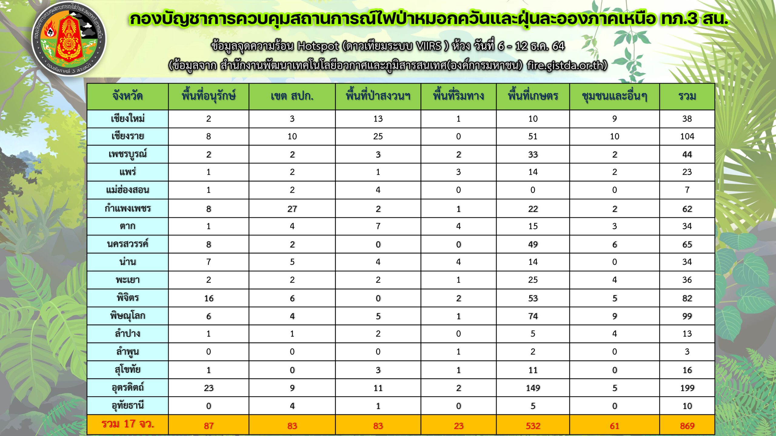 ขณะที่สถานการณ์จุดความร้อนในพื้นที่ 17 จังหวัดภาคเหนือ (ดาวเทียมระบบ VIIRS) ห้วงวันที่ 6 – 12 ธ.ค.64 พบเกิดจุดความร้อนสะสมจำนวน 869 จุด โดยพบในพื้นที่เกษตร จำนวน 532 จุด, พื้นที่ป่าอนุรักษ์ จำนวน 87 จุด ใน จ.อุตรดิตถิ์ มีจุดความร้อนมากที่สุด 149 จุด,พื้นที่ป่าสงวนฯ จำนวน 83 จุด มีพื้นที่จุดความร้อนมากที่สุด คือ จ.เชียงราย. จำนวน 25 จุด และเขต สปก. จำนวน 83 จุด มีพื้นที่จุดความร้อนมากที่สุด คือ จ.กำแพงเพชร จำนวน 27 จุด