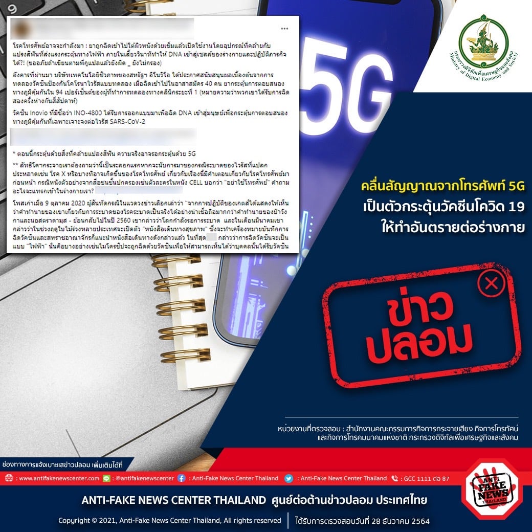 ตามที่มีการเผยแพร่ข้อมูลในสื่อสังคมออนไลน์เรื่อง คลื่นสัญญาณจากโทรศัพท์ 5G เป็นตัวกระตุ้นวัคซีนโควิด 19 ให้ทำอันตรายต่อร่างกาย ทางศูนย์ต่อต้านข่าวปลอมได้ดำเนินการตรวจสอบข้อเท็จจริงโดย สำนักงานคณะกรรมการกิจการกระจายเสียง กิจการโทรทัศน์ และกิจการโทรคมนาคมแห่งชาติ กระทรวงดิจิทัลเพื่อเศรษฐกิจและสังคม พบว่าประเด็นดังกล่าวนั้น เป็นข้อมูลเท็จ