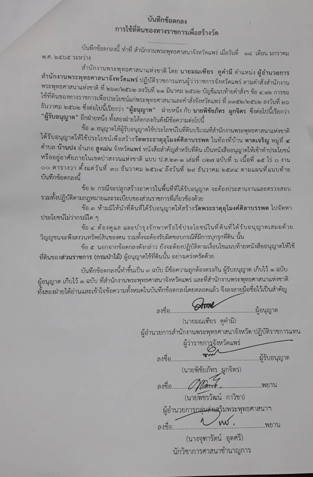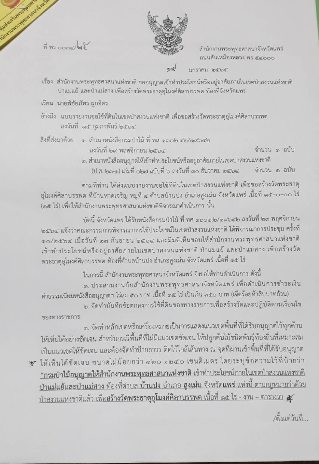 มอบหนังสือสำคัญการอนุญาตให้ใช้พื้นที่ป่าสงวนฯ เพื่อสร้างวัดพระธาตุอุโมงค์ศิลาบรรพต (จำบอน) ในท้องที่บ้านหาดเจริญ ตามระเบียบและเงื่อนไขของกรมป่าไม้ ในฐานะผู้รับอนุญาต โดยได้มอบไว้ให้กับสำนักสงฆ์จำบอน เป็นที่เรียบร้อยแล้ว