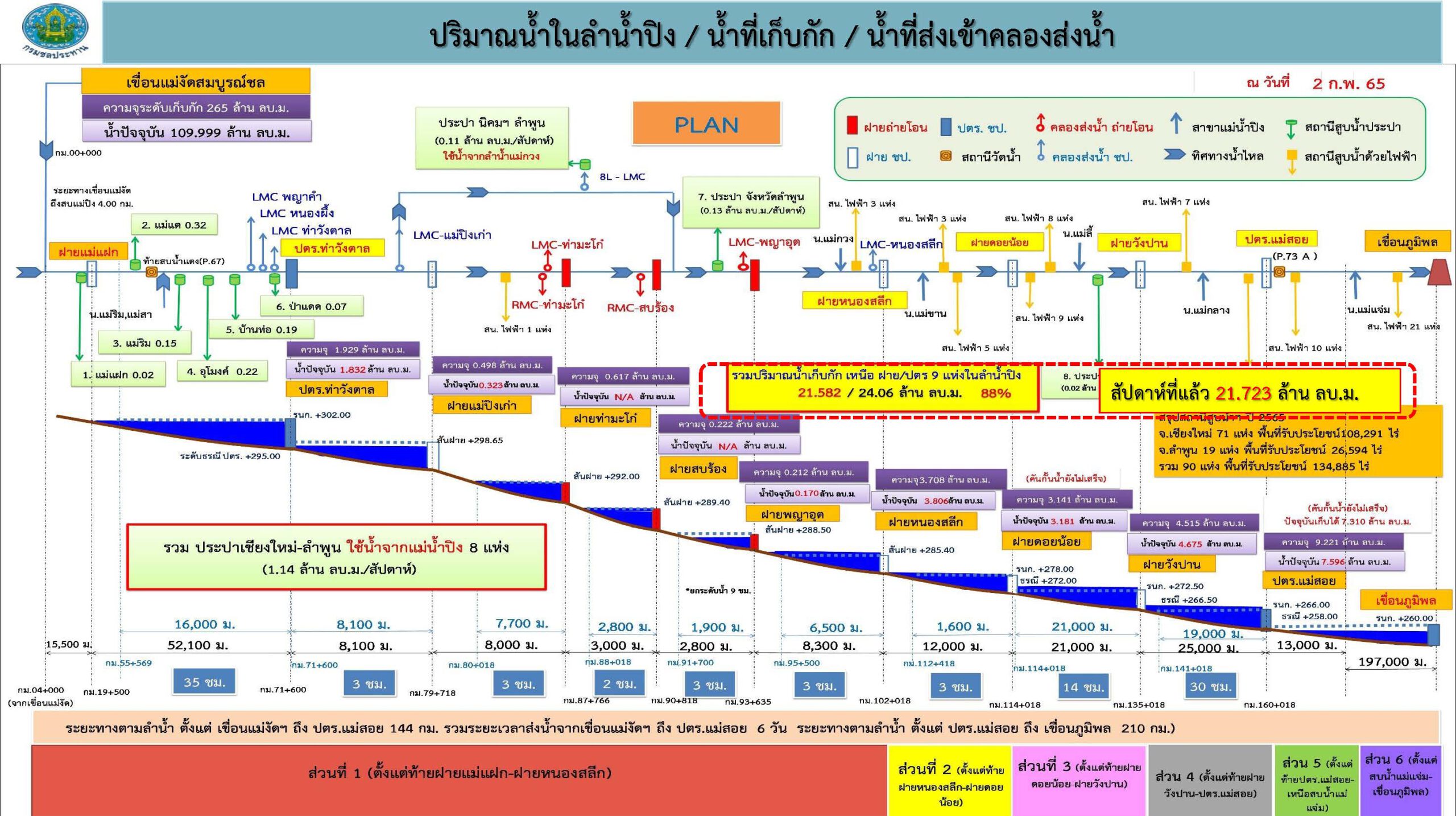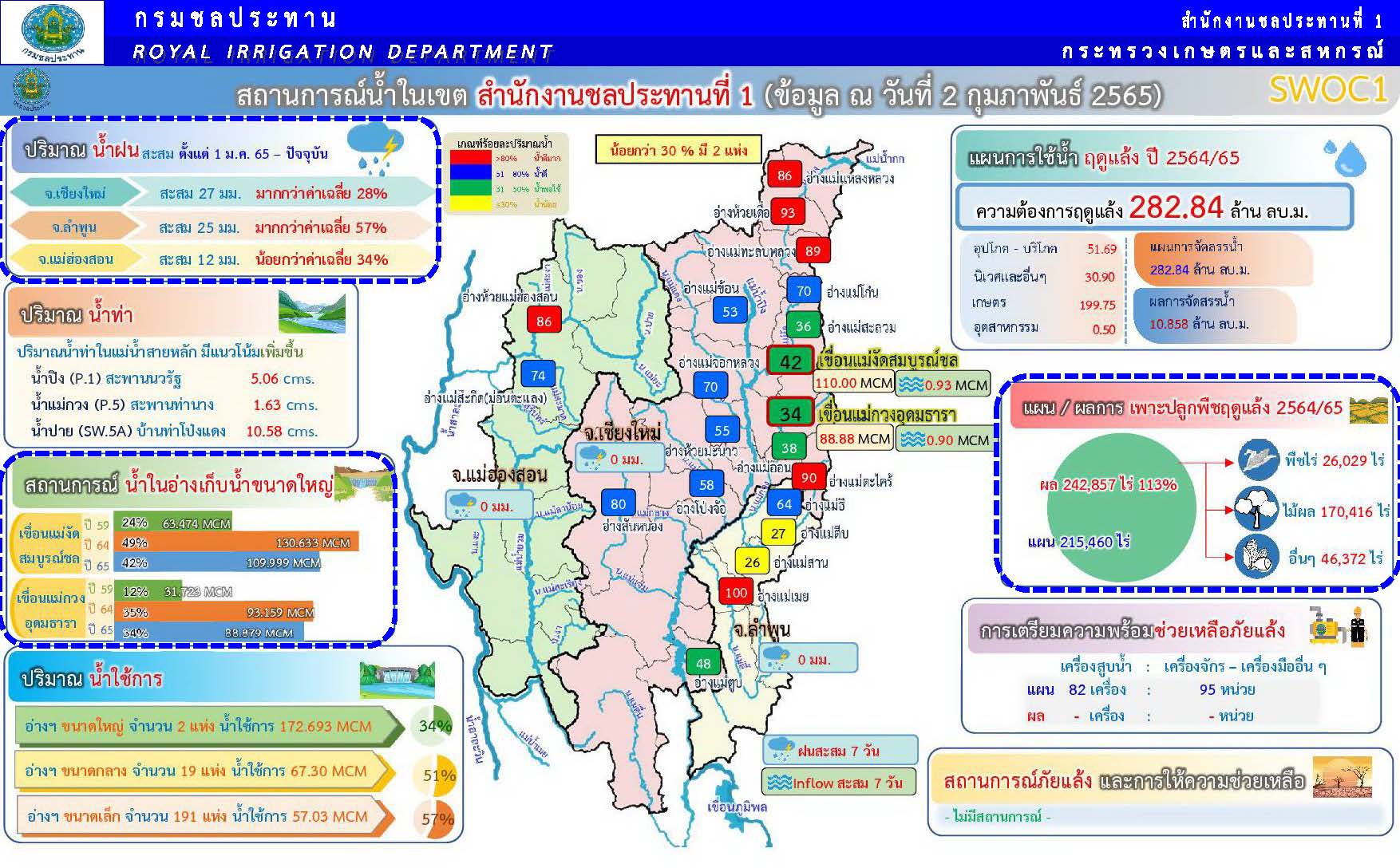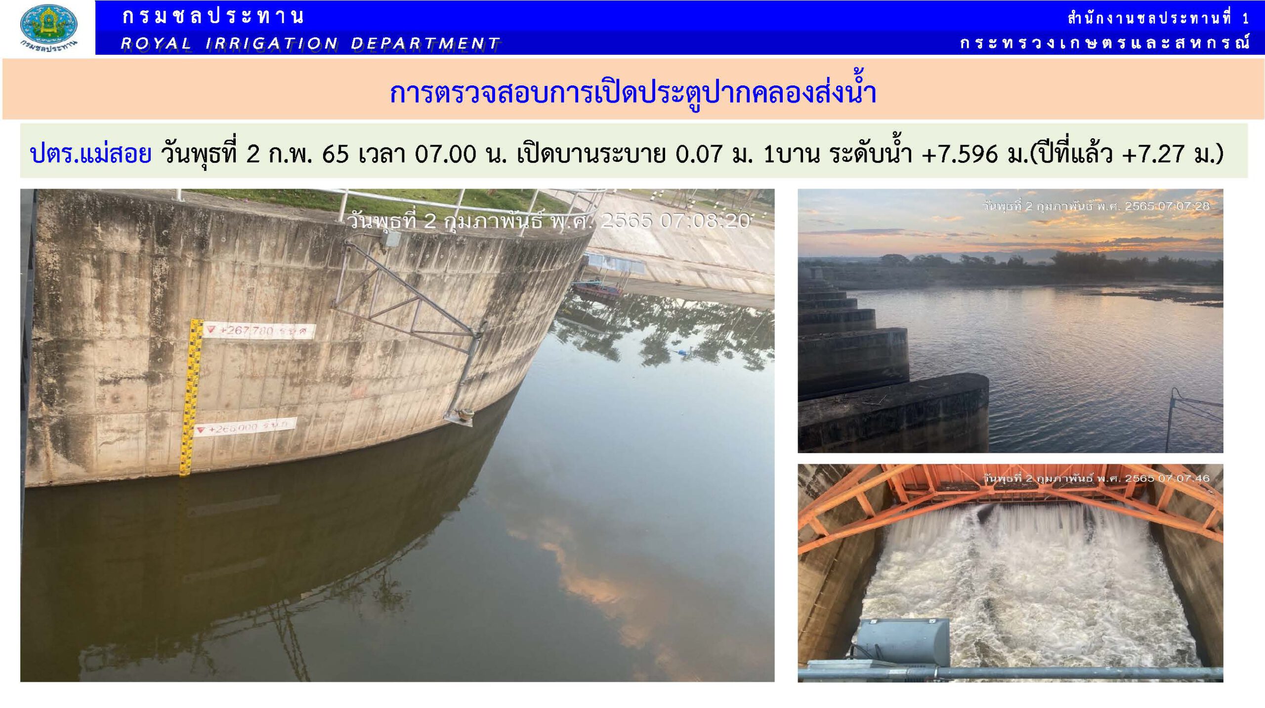 “จากที่ประชุมทราบว่า ปัจจุบันเขื่อนขนาดใหญ่ ทั้งเขื่อนแม่งัดสมบูรณ์ชลและเขื่อนแม่กวงอุดมธารา มีการใช้น้ำเป็นไปตามแผน ส่วนสถานการณ์น้ำในอ่างเก็บน้ำขนาดกลางก็อยู่ในเกณฑ์ดี มีน้ำเพียงพอสำหรับการจะบริหารจัดการในช่วงฤดูแล้งนี้ไปจนสิ้นสุดฤดูกาล สาระสำคัญอีกประการคือ การพิจารณาการระบายน้ำจากเขื่อนแม่งัดฯ ในรอบเวรที่ 5 ซึ่งจะเริ่มระบายน้ำในวันที่ 4 ก.พ. 65 จากการติดตามสถานการณ์น้ำตั้งแต่ ปตร.ท่าวังตาล ไปจนถึง ปตร.แม่สอย ซึ่งเป็นจุดสุดท้ายในเขต อ.จอมทอง พบว่า ปริมาณน้ำที่คงค้างอยู่ในระบบทางน้ำหรือในแม่น้ำปิงหน้าฝายต่างๆ มีปริมาณค่อนข้างดี ประกอบกับการคาดการณ์อากาศของกรมอุตุนิยมวิทยาคาดว่าในวันที่ 4-6 ก.พ. อาจจะมีฝนตก เป็นฝนตกเล็กน้อย ถึงไม่มากแต่ก็ถือว่าสามารถเป็นแหล่งน้ำต้นทุนให้พื้นที่ได้บางส่วน” ผจบ.ชป.1 กล่าว