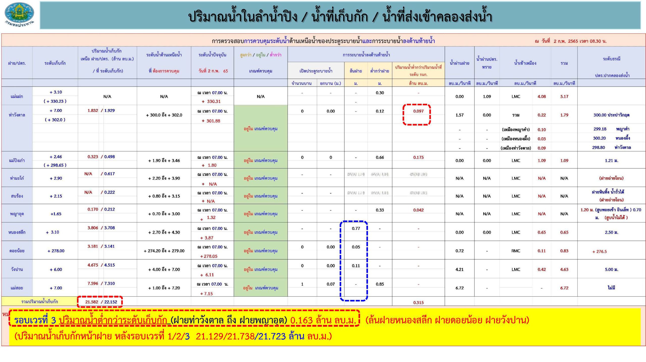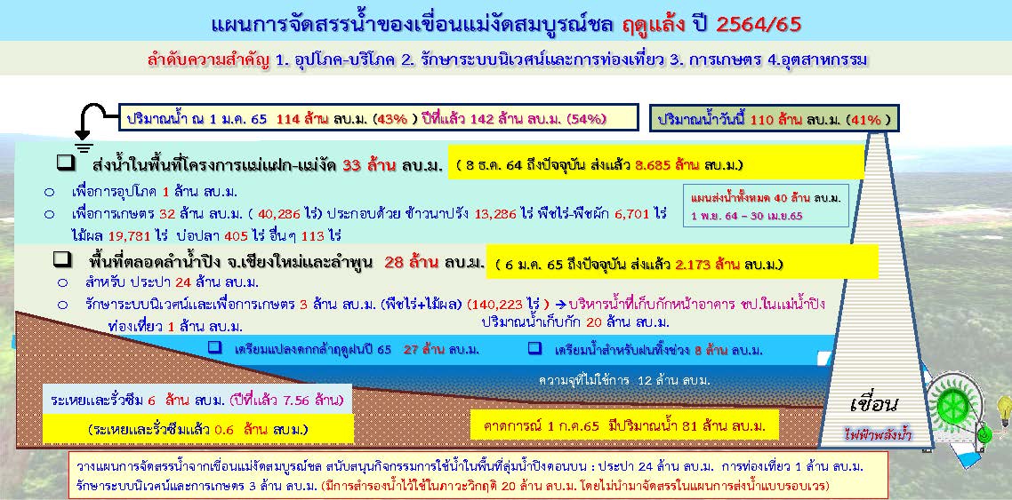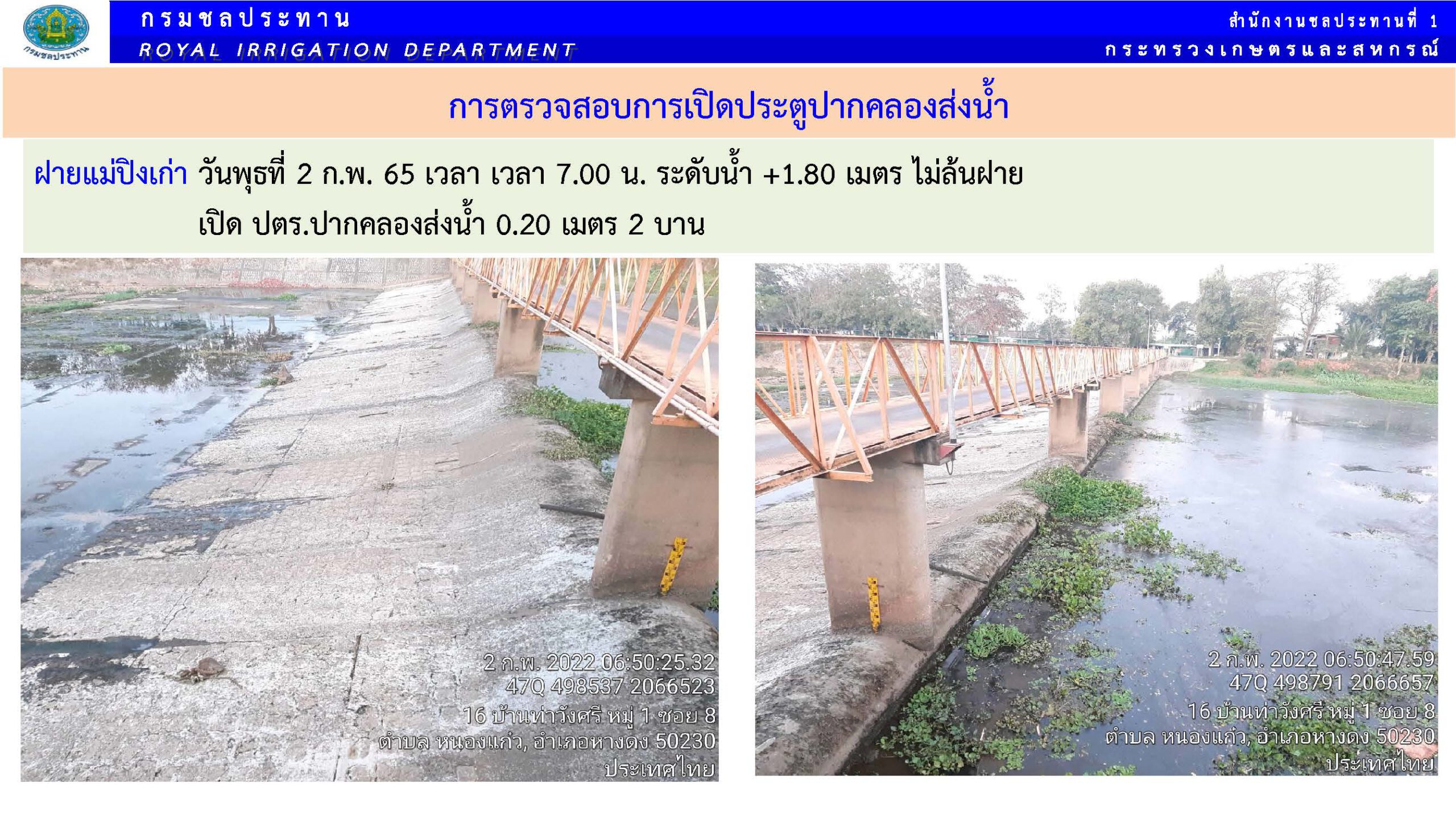 “จากที่ประชุมทราบว่า ปัจจุบันเขื่อนขนาดใหญ่ ทั้งเขื่อนแม่งัดสมบูรณ์ชลและเขื่อนแม่กวงอุดมธารา มีการใช้น้ำเป็นไปตามแผน ส่วนสถานการณ์น้ำในอ่างเก็บน้ำขนาดกลางก็อยู่ในเกณฑ์ดี มีน้ำเพียงพอสำหรับการจะบริหารจัดการในช่วงฤดูแล้งนี้ไปจนสิ้นสุดฤดูกาล สาระสำคัญอีกประการคือ การพิจารณาการระบายน้ำจากเขื่อนแม่งัดฯ ในรอบเวรที่ 5 ซึ่งจะเริ่มระบายน้ำในวันที่ 4 ก.พ. 65 จากการติดตามสถานการณ์น้ำตั้งแต่ ปตร.ท่าวังตาล ไปจนถึง ปตร.แม่สอย ซึ่งเป็นจุดสุดท้ายในเขต อ.จอมทอง พบว่า ปริมาณน้ำที่คงค้างอยู่ในระบบทางน้ำหรือในแม่น้ำปิงหน้าฝายต่างๆ มีปริมาณค่อนข้างดี ประกอบกับการคาดการณ์อากาศของกรมอุตุนิยมวิทยาคาดว่าในวันที่ 4-6 ก.พ. อาจจะมีฝนตก เป็นฝนตกเล็กน้อย ถึงไม่มากแต่ก็ถือว่าสามารถเป็นแหล่งน้ำต้นทุนให้พื้นที่ได้บางส่วน” ผจบ.ชป.1 กล่าว