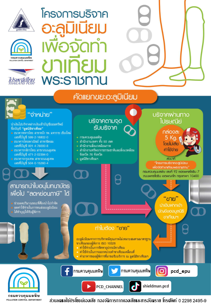 สำนักงานทรัพยากรธรรมชาติและสิ่งแวดล้อมจังหวัดเชียงใหม่ เชิญชวนประชาชนร่วมบริจาคอะลูมิเนียม นำไปใช้เป็นต้นทุนในการจัดทำอุปกรณ์ขาเทียมให้แก่ผู้พิการ และผู้สูงอายุ มูลนิธิขาเทียมในสมเด็จพระศรีนครินทราบรมราชชนนี